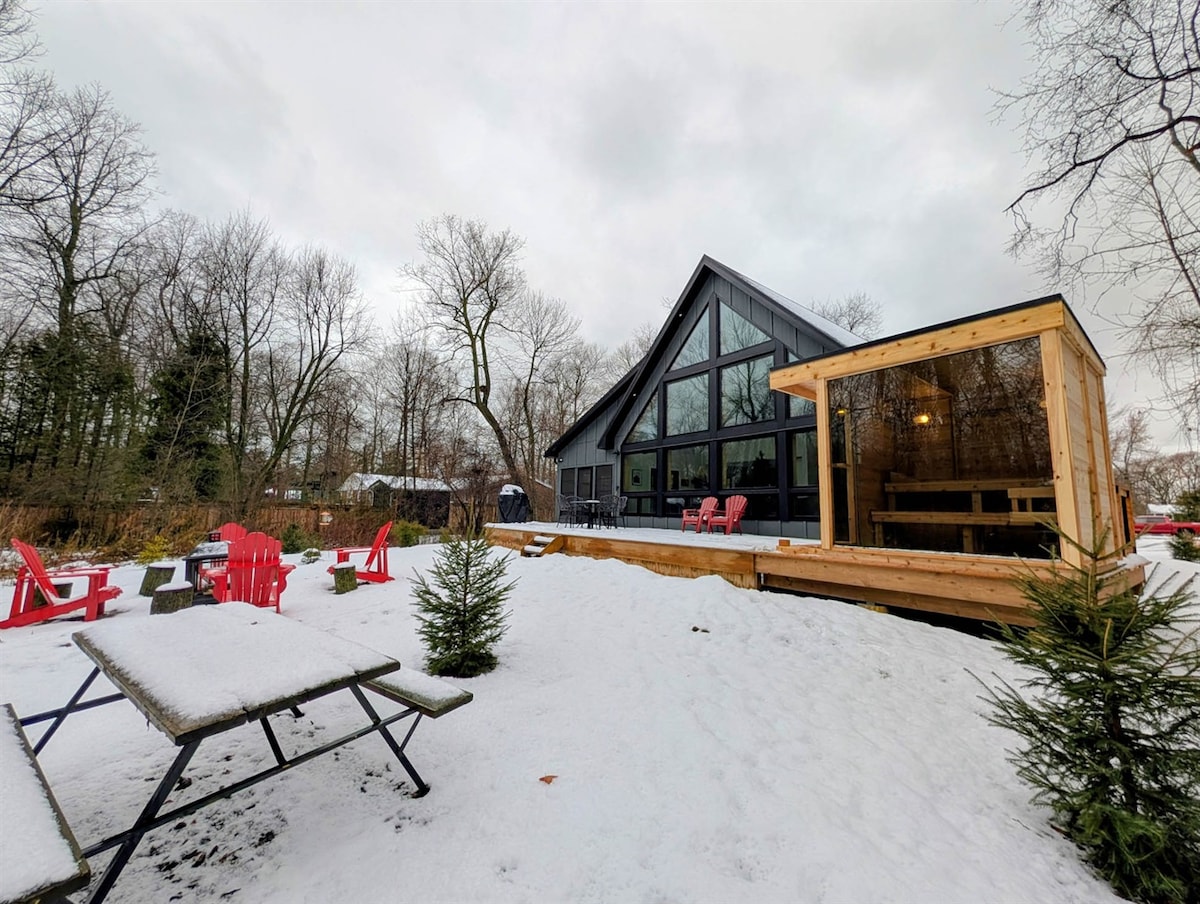 Step outside and breathe in the fresh air! This brand new cottage is the perfect place to unwind and enjoy nature. Here are just a few of the outdoor highlights: a spacious deck to soak up the sun, a cozy firepit for evening gatherings, and a comfortable outdoor living room to relax and take in the sights and sounds. Don't forget to fire up the propane BBQ for a delicious meal at the iron dining table. And for those chillier nights, head to the screened porch with heated floors for a warm and inviting dining experience. Plus, you'll enjoy the privacy of this lot, which backs onto a protected forested area in the charming village.