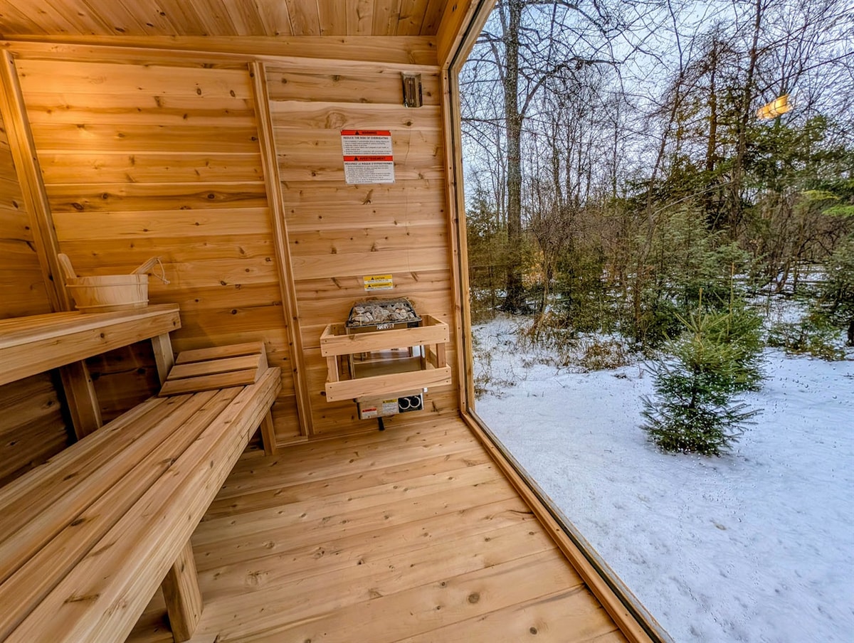 And now, the star of the space — a brand-new sauna with floor-to-ceiling windows overlooking the surrounding nature and treed backyard. It’s the perfect place to warm up, unwind, and enjoy peaceful views in every season.