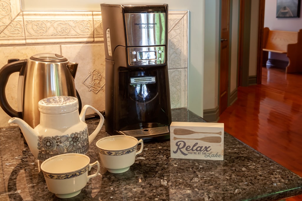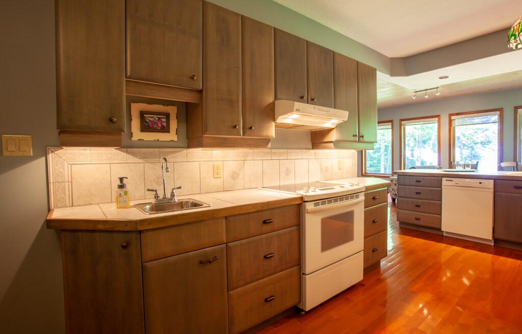 Spacious kitchen with everything you need to prepare your favorite dishes. There's a large pantry so you will have lots of room to store all your food! A countertop bar with 4 barstools and small dining table which seats 4 in the kitchen with views of the lake. Everyone will enjoy helping! And there's another dining area that seats 6.