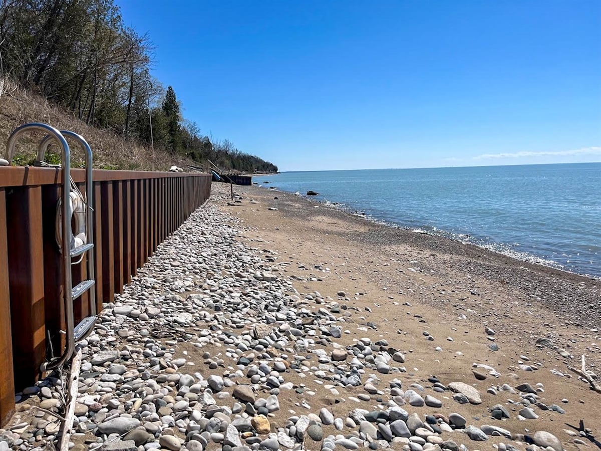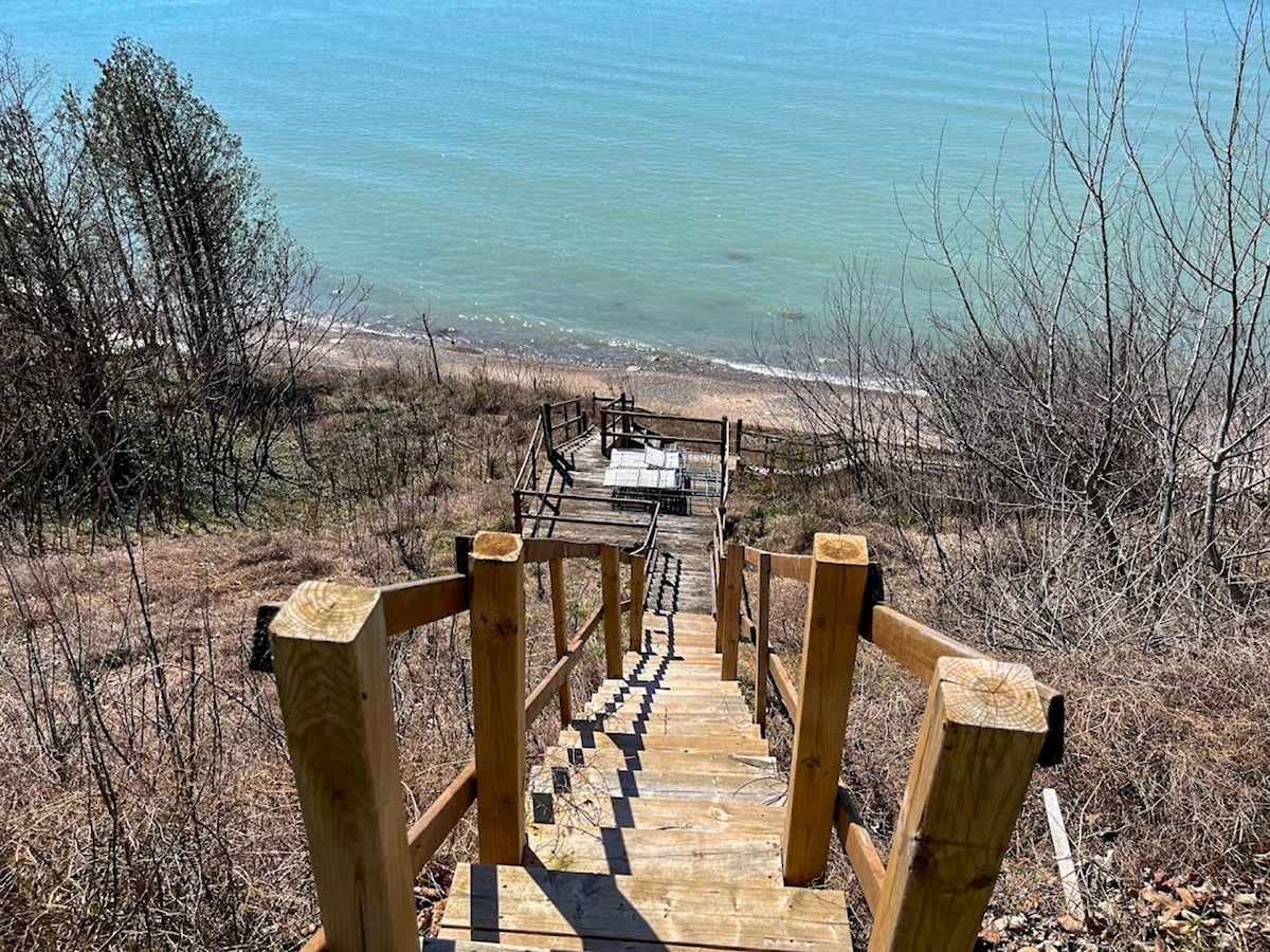 Take approx. 80 stairs down your private access to the lake. The lakebed can be sandy or stoney depending on what the lake gives you that day. But it sure is fun to try to find the ever changing sandbars. Even if it's stoney...it's fun to go stone collecting - Lake Huron is a geologists paradise! Just bring some water shoes. The nice thing is, it's not weedy or slimy at all.