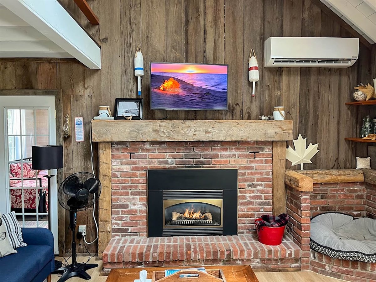 INSIDESpacious living area with gas fireplace and AC. Cuddle up and watch a movie on the Smart TV or enjoy the lake views with wall to wall windows.