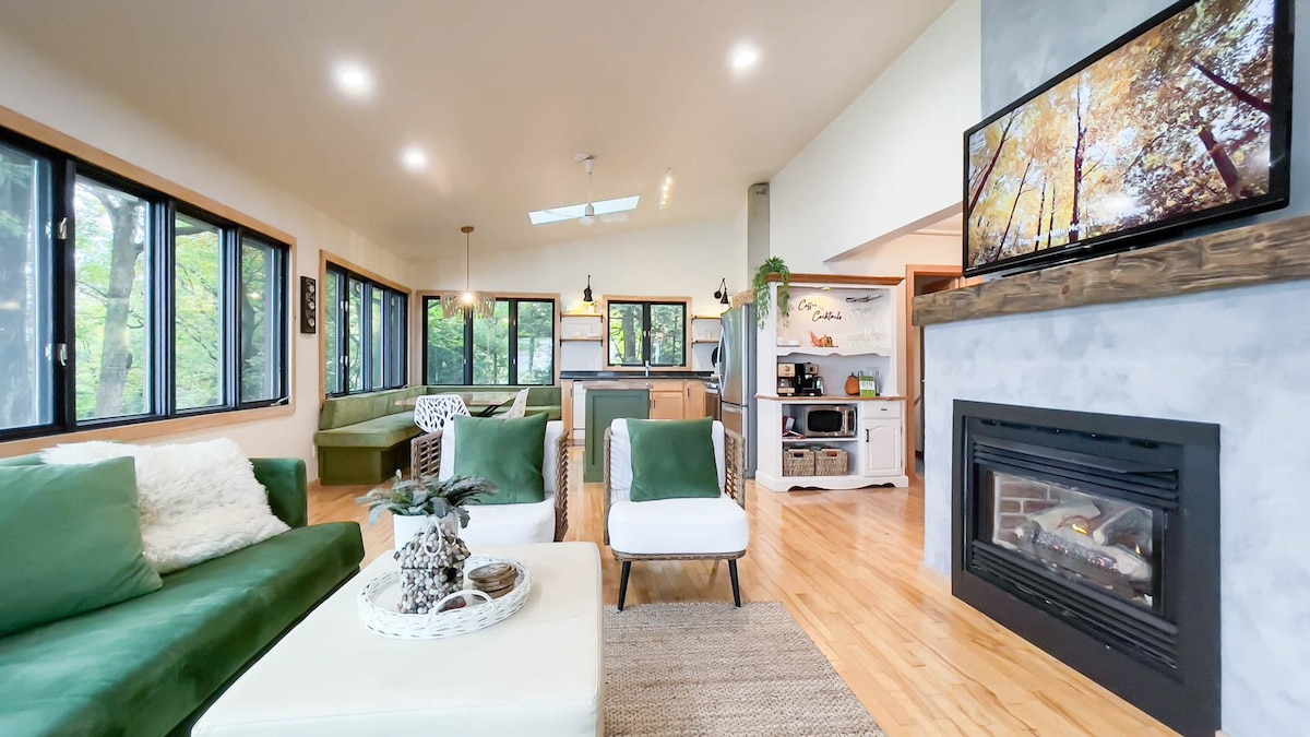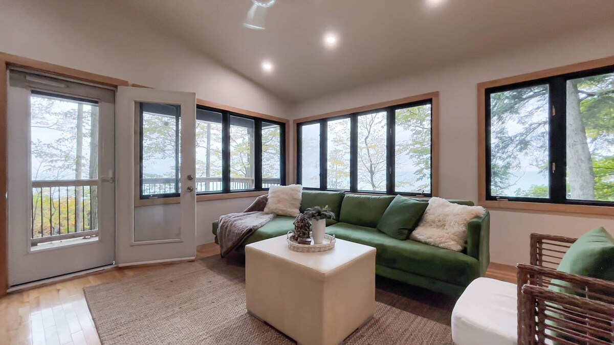 Living Area has gas fireplace with sweeping views of the the lake. TV with Firestick including Netflix/Primevideo. You can also plug your device in. There is good WIFI. Even on a rainy day it's so cool to watch a movie and the storm! Have I mentioned that this lakefront property now features air conditioning? Despite that, I still adore the incredible breeze from the Lake.