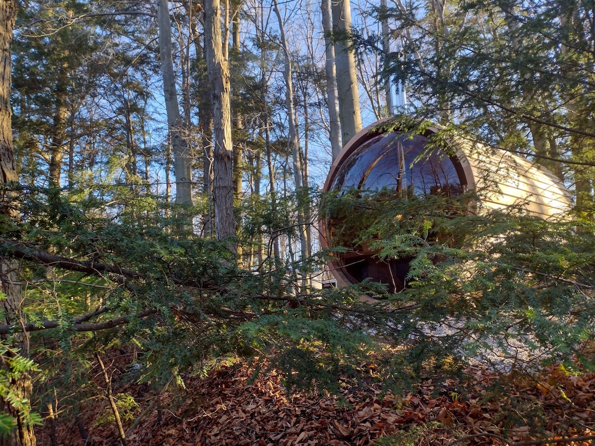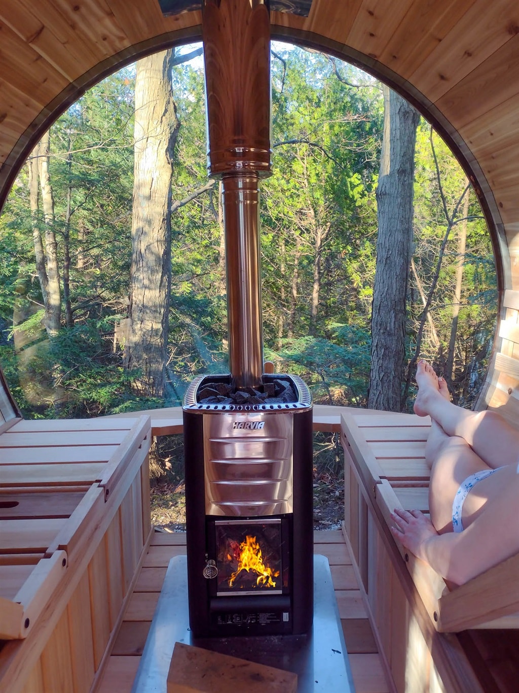 Wood fired cedar barrel sauna with Panoramic dome window overlooking the ravine. This is truly special what a treat.