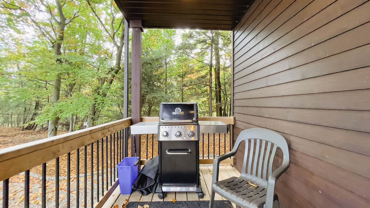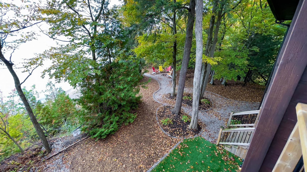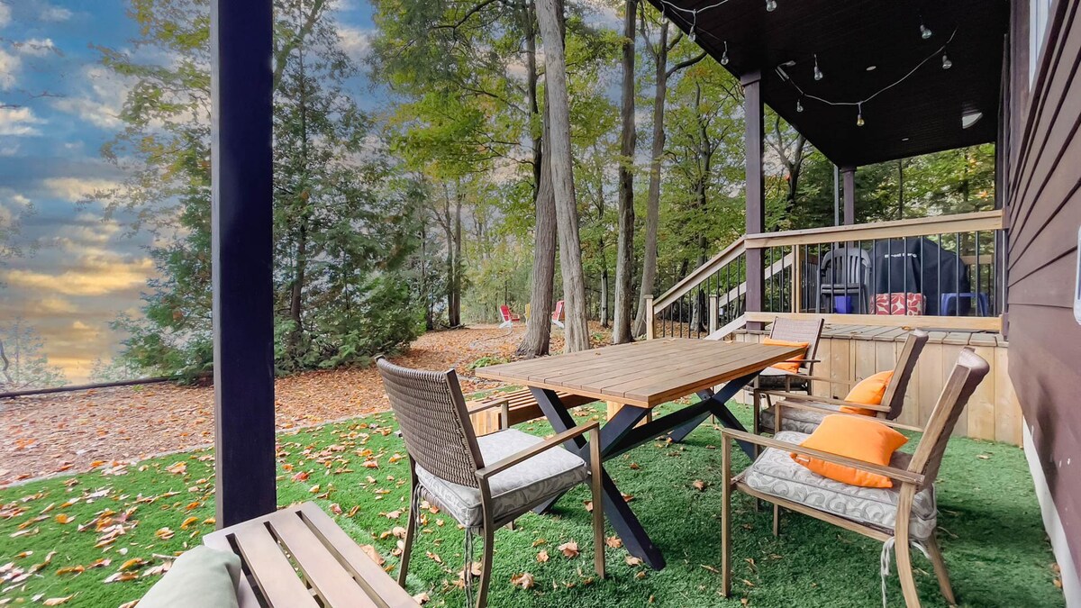 Stone pathways lead to outside living area overlooking the lake. Here you have your choice of Propane BBQ or a charcoal BBQ to create your family favorites. Dine together at the teak dining table overlooking the lake. OR chat together on the comfy outdoor living area complete with day bed. OR take a nap in the hammock with ravine and lake views.