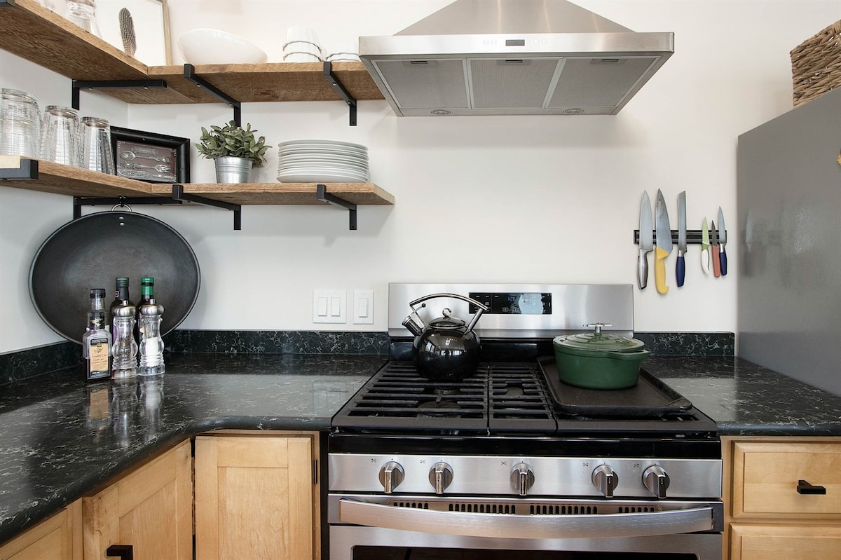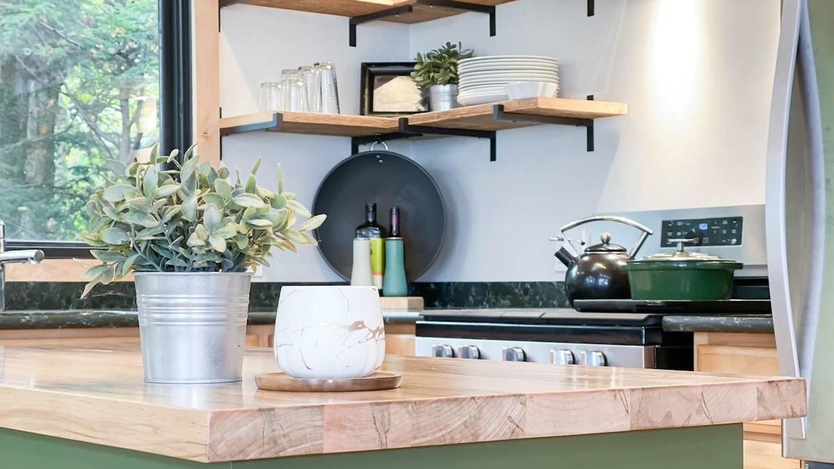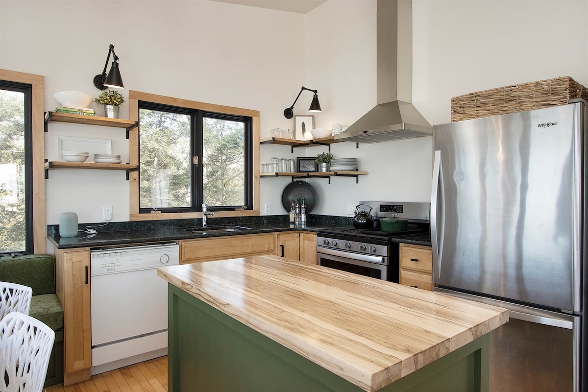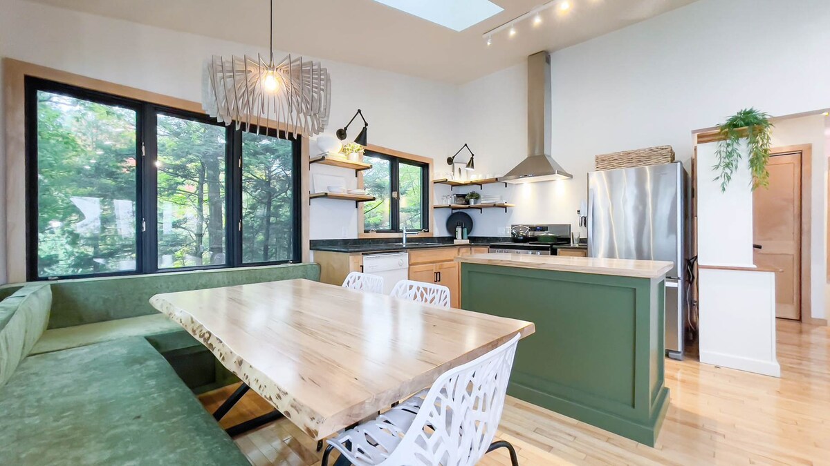 Kitchen is clean and bright with everything you need to prepare meals in. Fridge, Stove, Microwave, Dishwasher etc. Live edge dining table seats 6-8
