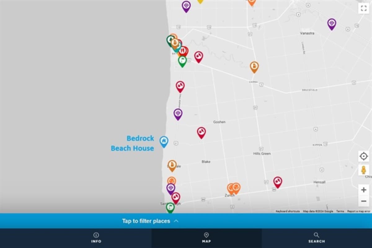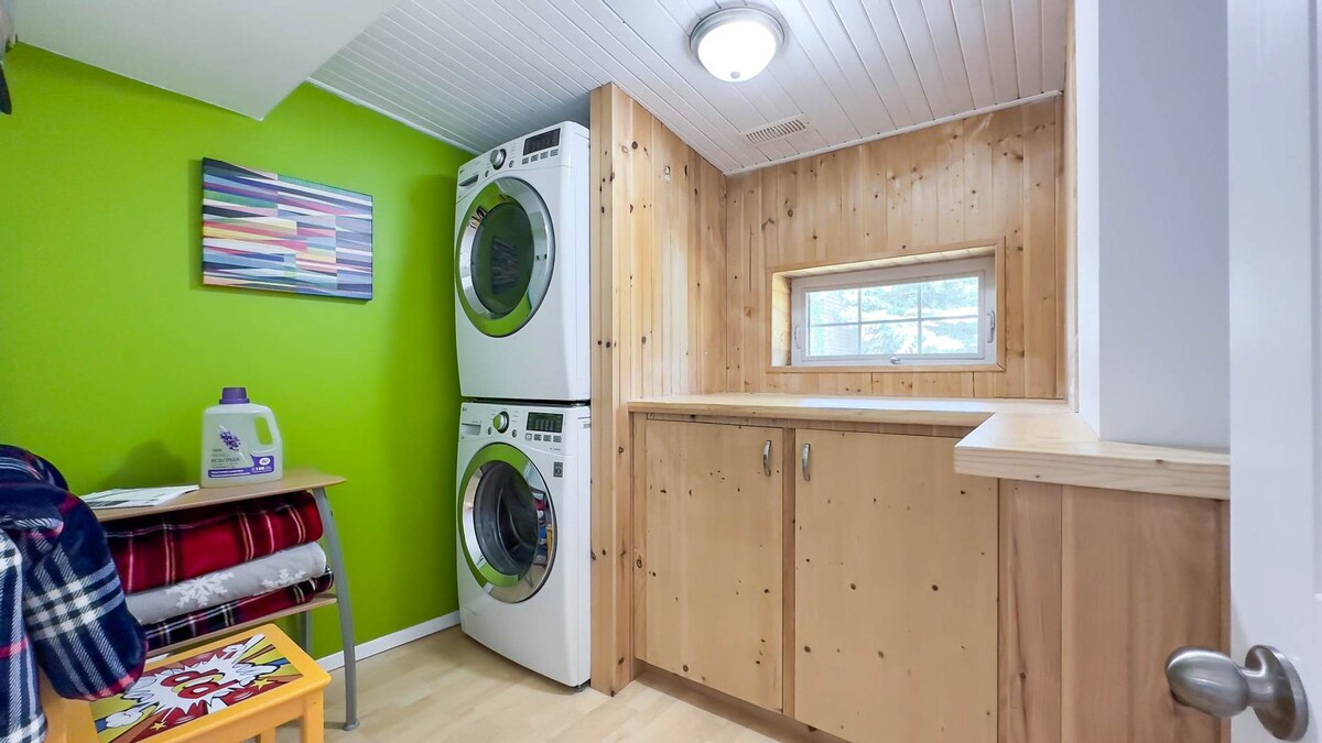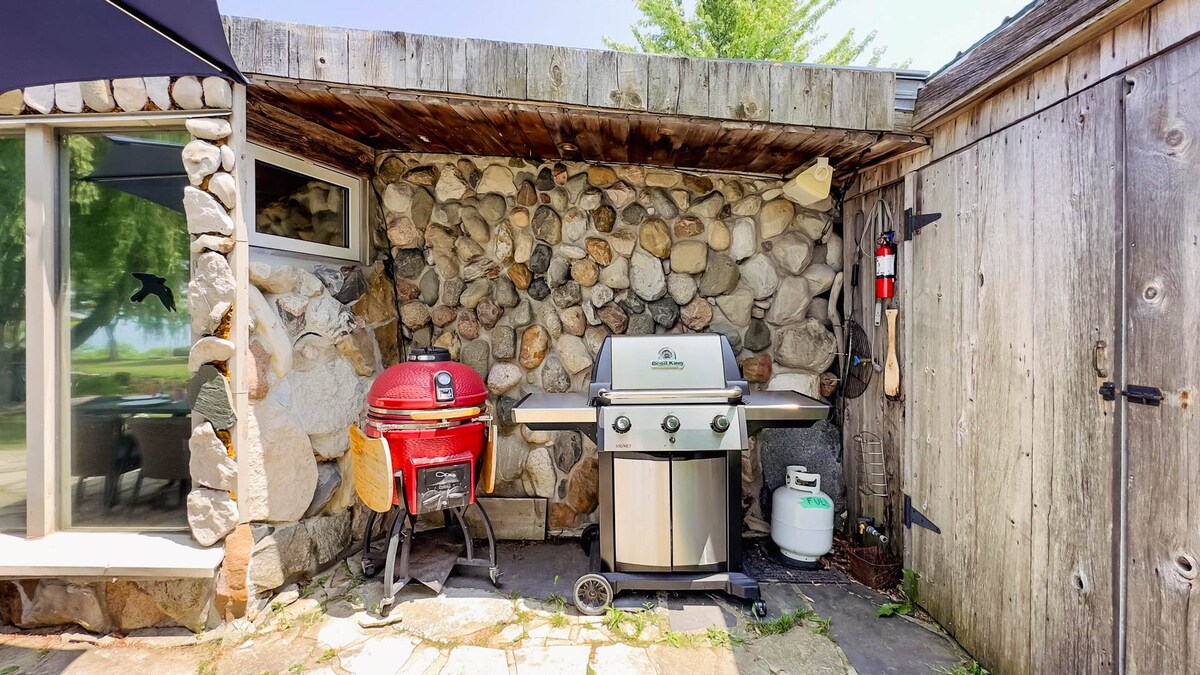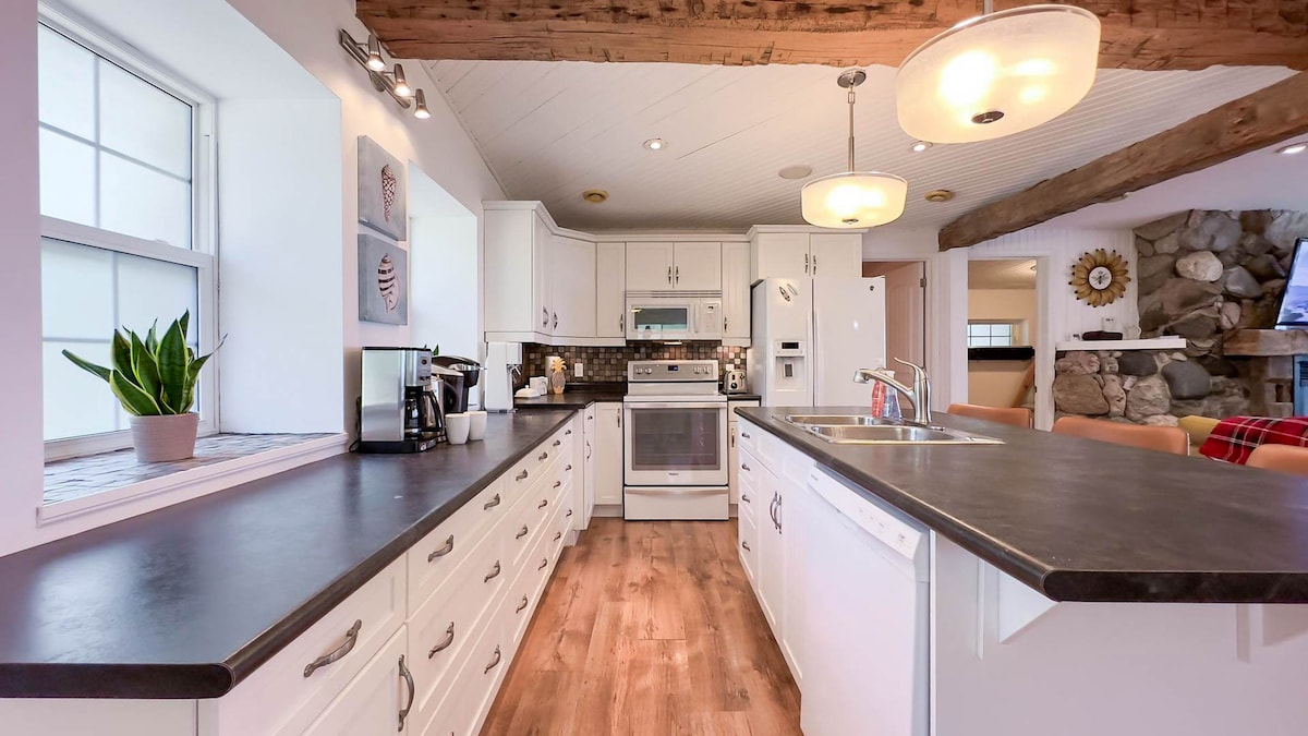 INSIDEOpen concept featuring reclaimed barn wood beams, thick stone walls, and an airy interior with a full wall of windows that makes the most of the phenomenal views, the Bedrock Beach House inspires a deep sense of peace and happiness. The open kitchen is clean and bright with everything you need to prepare meals in. Fridge, Stove, Microwave, dishwasher etc. Seating for 4 at the dining table plus an additional 3 seats at the island.where you can chat with the chef and enjoy a meal together, all the while looking at the lake.