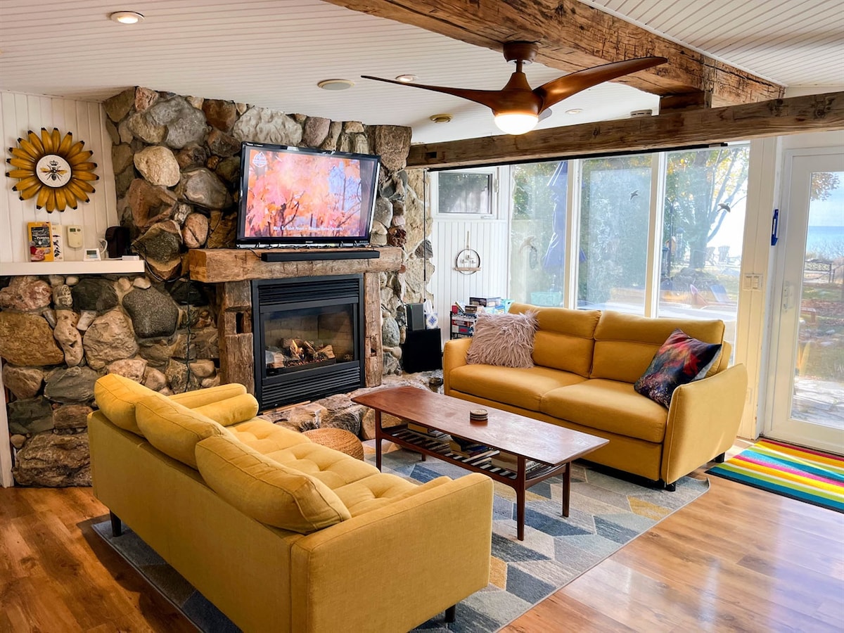 Living Area has gas fireplace with sweeping views of the the lake. SmartTV so you can login to your own Netflix or enjoy cable we have provided. You can also plug your device in. There is great WIFI. Even on a rainy day it’s so cool to watch a movie and the storm!
