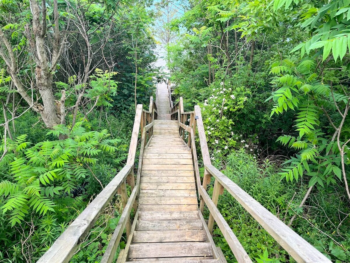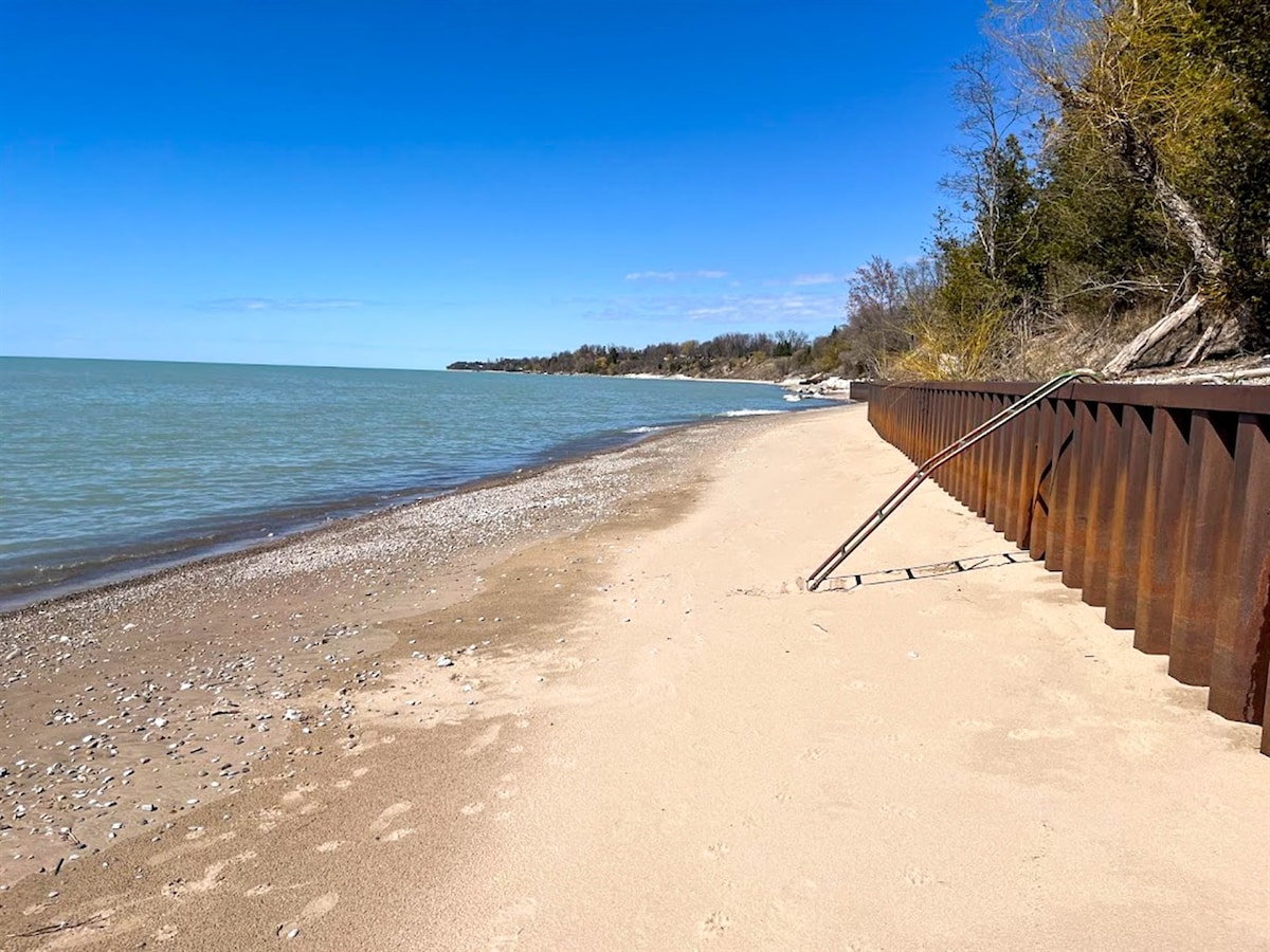 NOTE: Approx 80 stairs down to the beach. 2024 there is still beach. The lakebed can be sandy or stoney depending on what the lake gives you that day. But it sure is fun to try to find the ever changing sandbars. Generally you will find sand 3ft out. It's fun to go stone collecting - Lake Huron is a geologists paradise! Just bring some water shoes. The nice thing is, it's not weedy or slimy at all.