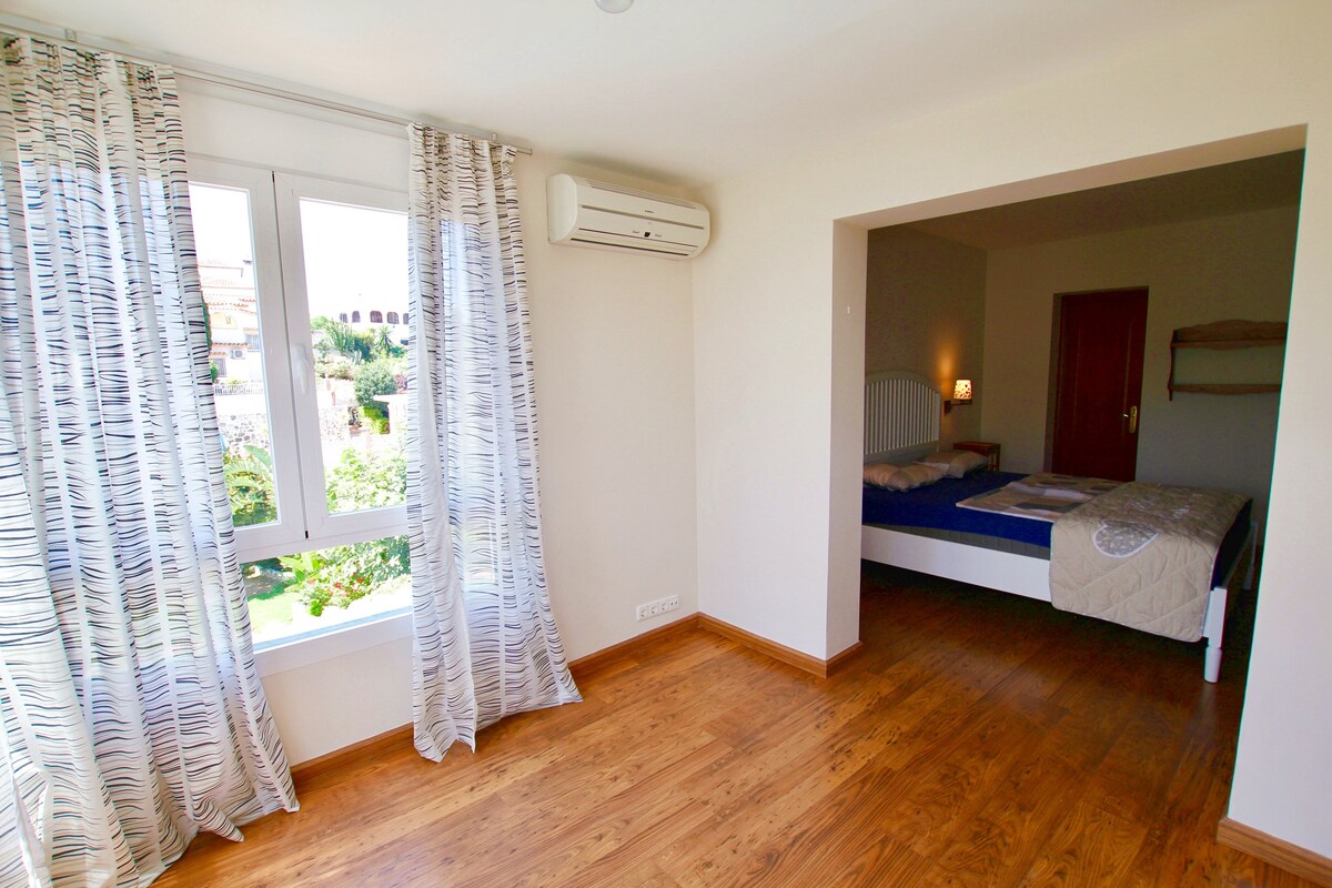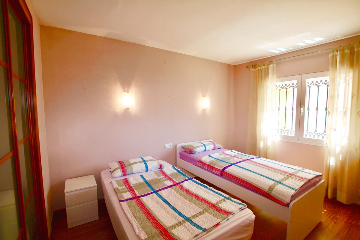 This spacious villa is superbly located close to numerous supermarkets, bars, restaurants, parks and entertainment but at the same time secluded and secure. It offers 3 levels with 4 bedrooms and 3.5 bathrooms, large garden perfect for BBQ. You will love the fantastic views of the pool and sea from the lounge terrace. Entering the main door you will find yourself on the main floor with a bright fully equipped kitchen, a dining area for 6 people and a living room with flat screen TV and fireplace. From the living room you access the generously sized terrace with covered lounge area. Relax with a glass of wine or a meal with your friends and family and enjoy the fantastic view of the pool and the sea. The guest bathroom is also available on this floor. On the middle level you will find three bedrooms. The master bedroom has a king size bed, ensuite bathroom, large wardrobe, pool view from the windows and free space where you can start your day with some morning exercises while enjoying the tranquility and sunlight. The other two bedrooms offer a king size bed and two single beds. In addition, there is a shared bathroom with a shower. All bedrooms on this level have built-in wardrobes. On the ground floor there is a separate studio with its own fully equipped kitchen and a bedroom with a double bed. The lounge area has a sofa that opens into a bed for 1 person and a flat screen TV. Air conditioning in the living room, the master bedroom and the study on the lower level. Both kitchens are equipped with all the necessary cutlery and dishes, refrigerator, microwave and stove. The kitchen on the main floor also has an oven, dishwasher and coffee maker. Downstairs you have a washing machine. The pool area, currently unavailable, has a dining area for 4 people, sun loungers and a gazebo covered with curly ivy perfect for barbecue. The territory of the villa is very green, secluded by lush flower bushes and covered from the sun by tall trees. This villa has everything you could wish for your perfect vacation! Renting this villa you will have: Upper level: Bedroom 1: King size bed, private bathroom, Air conditioning Bedroom 2: 2 single beds Bedroom 3: King size bed 1 bathroom with shower Middle level: Living room with TV, fireplace, Air conditioning Fully equipped kitchen with dining area Terrace with seating area and panoramic view Ground floor: Kitchen with dining area Bedroom with double bed Sofa bed for 1 person TV Air conditioning, dining area and gazebo with barbecue Wifi Parking on the street. Underground parking on request (free of charge). We also have a baby cot and a high chair for families with small children. The terrace is safe for children. The location of this villa is perfect, it offers privacy and tranquility, surrounded by other villas, but close to all amenities and entertainment. One of the best sandy beaches on the Costa del Sol is a 12 minute drive away. The center of Benalmádena is a 10 minute drive away, and the train station is a 20 minute drive away. There are many restaurants and supermarkets within a 10 minute walk. If you are traveling with children they will be delighted for Selwo Marina aquarium with dolphins and Paloma Park with rabbits and chickens are only a 6 minute drive away. Holiday villa for rent on the Costa del Sol. Baby package €39: including cot and high chair, on request and subject to availability. The courtesy set is provided only for the beginning and not for the whole stay.The swimming pools have very different opening hours, please inquire before booking to ensure the pool is open during your stay.