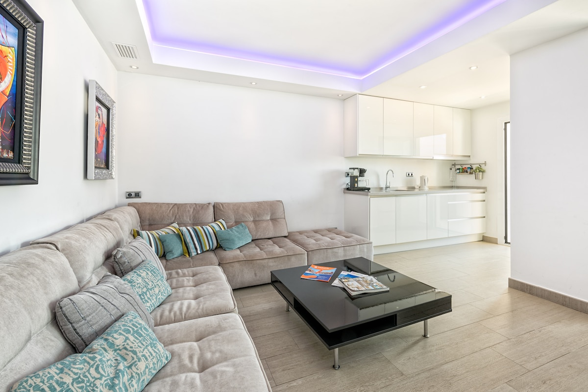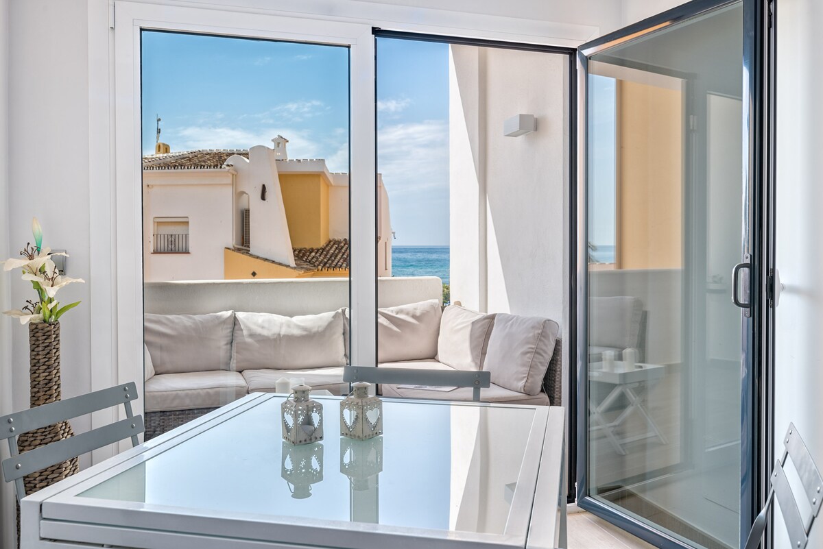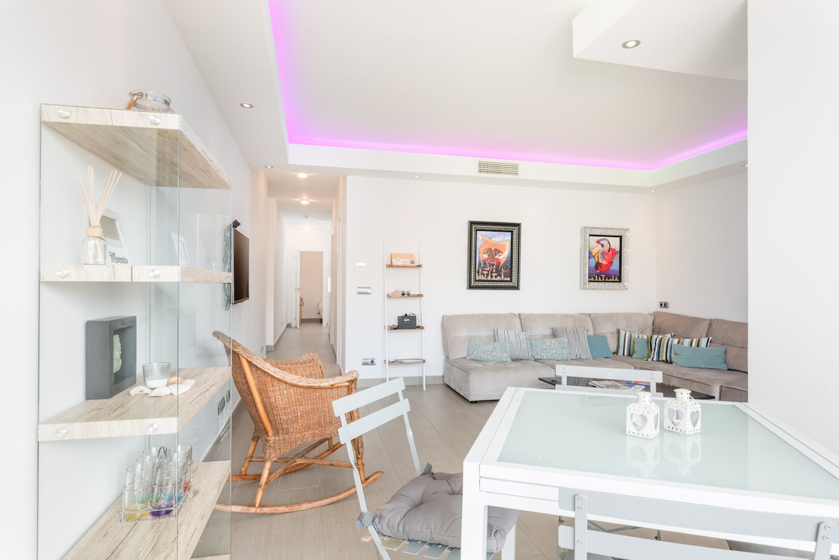 Holiday apartment for rent in Marbella. Fabulous first beach line apartment for short term rent with modern design, full equipment and multiple onsite facilities. This chic holiday apartment is located within a secure urbanization with free parking, restaurants, bars, swimming pools, included a children´s pool, children´s playground and a direct access to the perfect sandy beach.