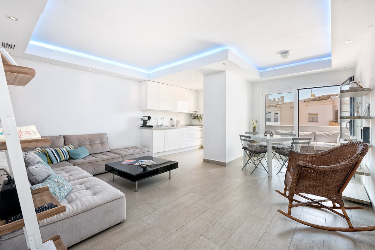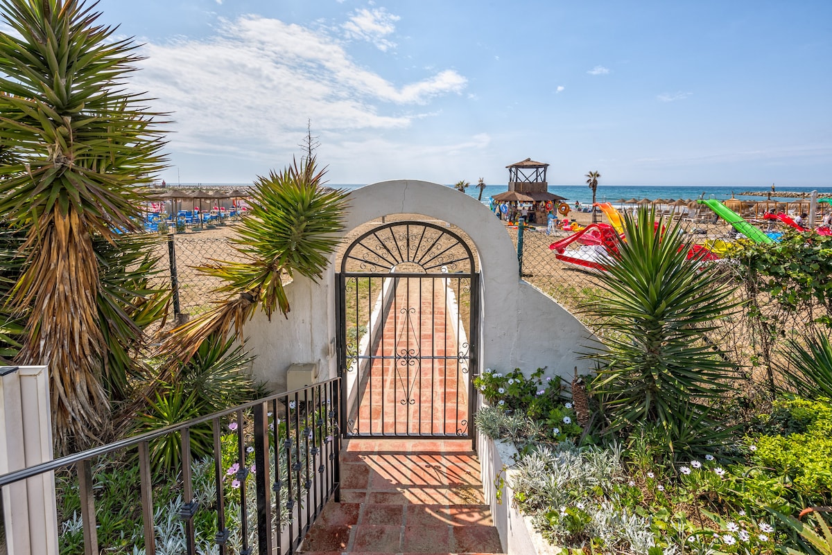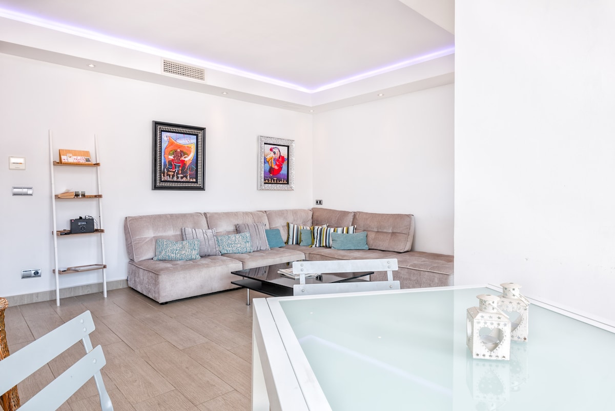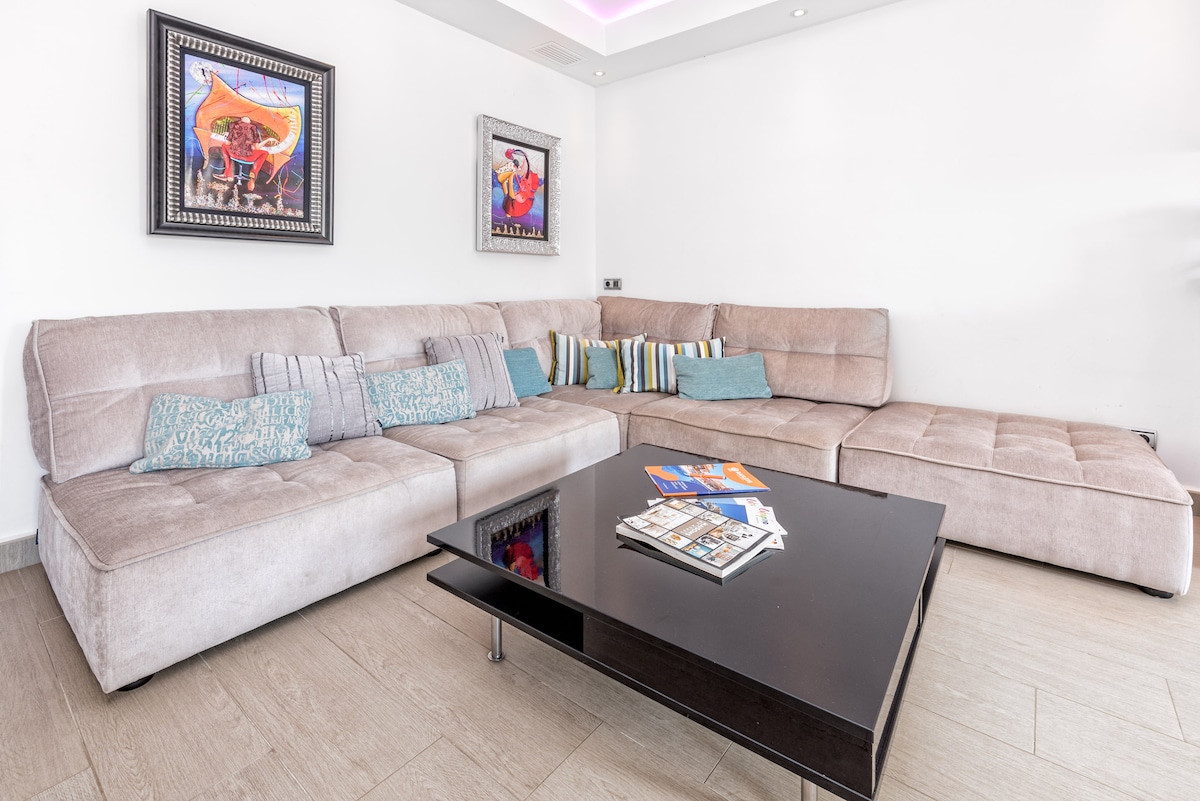 Holiday apartment for rent in Marbella. Fabulous first beach line apartment for short term rent with modern design, full equipment and multiple onsite facilities. This chic holiday apartment is located within a secure urbanization with free parking, restaurants, bars, swimming pools, included a children´s pool, children´s playground and a direct access to the perfect sandy beach.