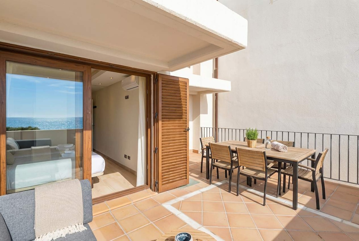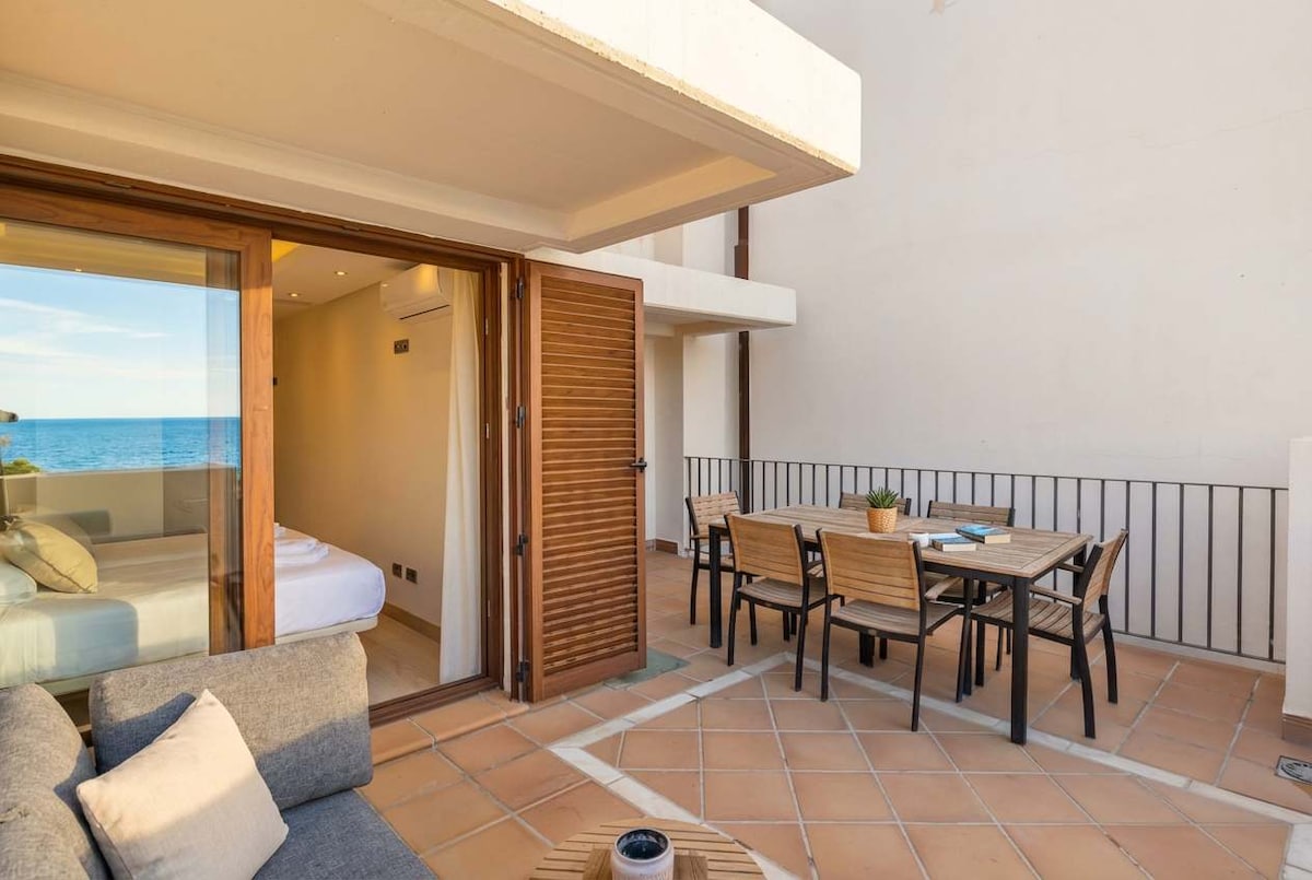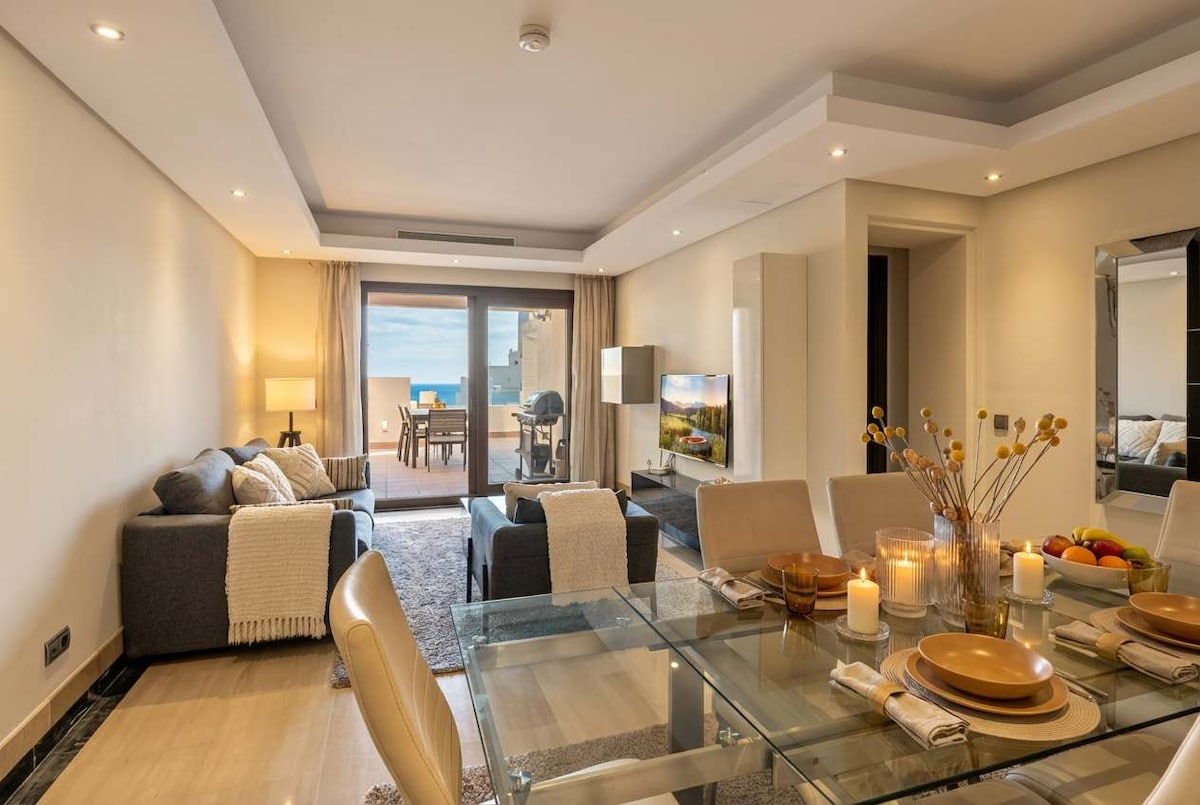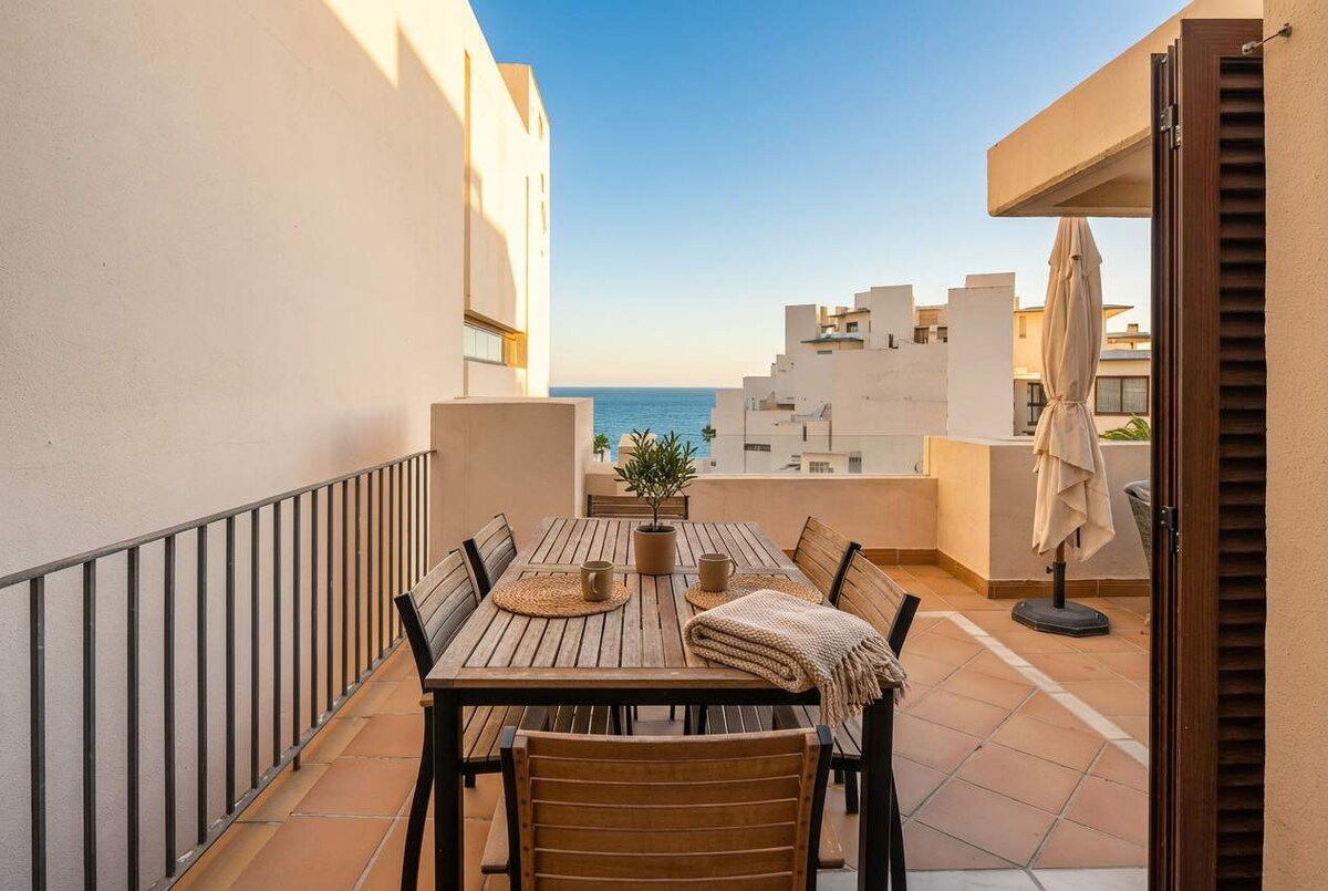 Further out from the living room is the first terrace with stunning views of the Mediterranean sea and the urbanization, here is a lounge group, gas BBQ and a dining table for up to 6 persons.