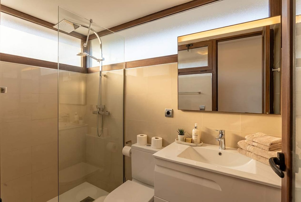 The master bedrooms is located on the bottom floor with a double bed and ensuite bathroom with direct access to the first terrace, the second bedroom is located on the top floor with a full bathroom with shower.