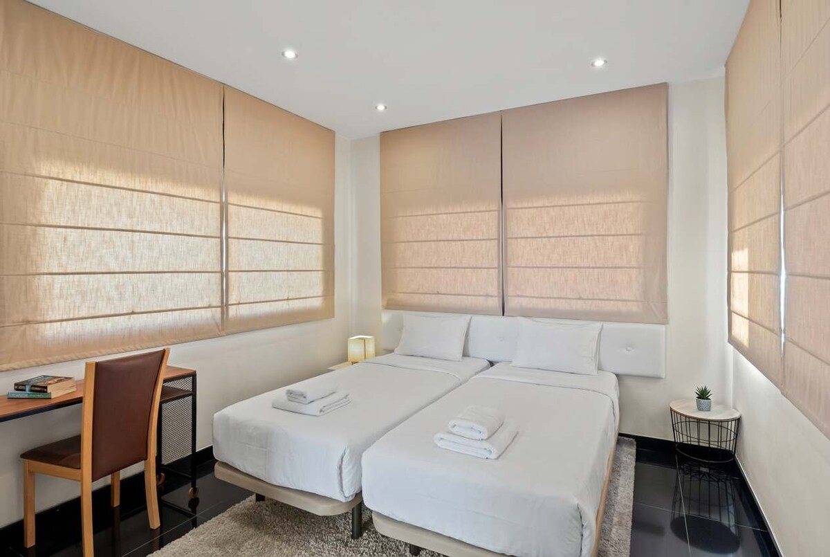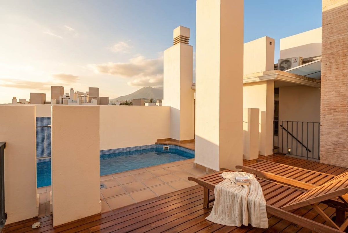 From the living room goes a spiral staircase up to the top floor of the apartment where you got the private pool with stunning views and a private sundeck and 2 sun loungers.