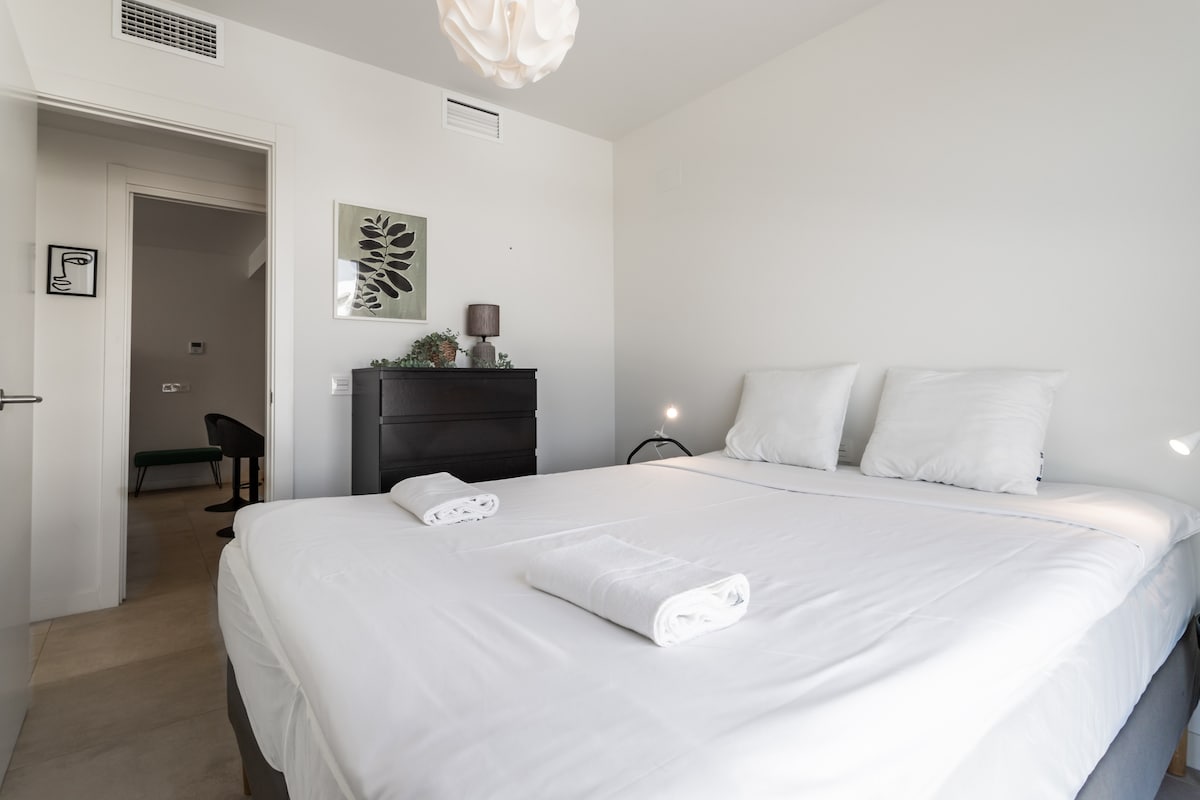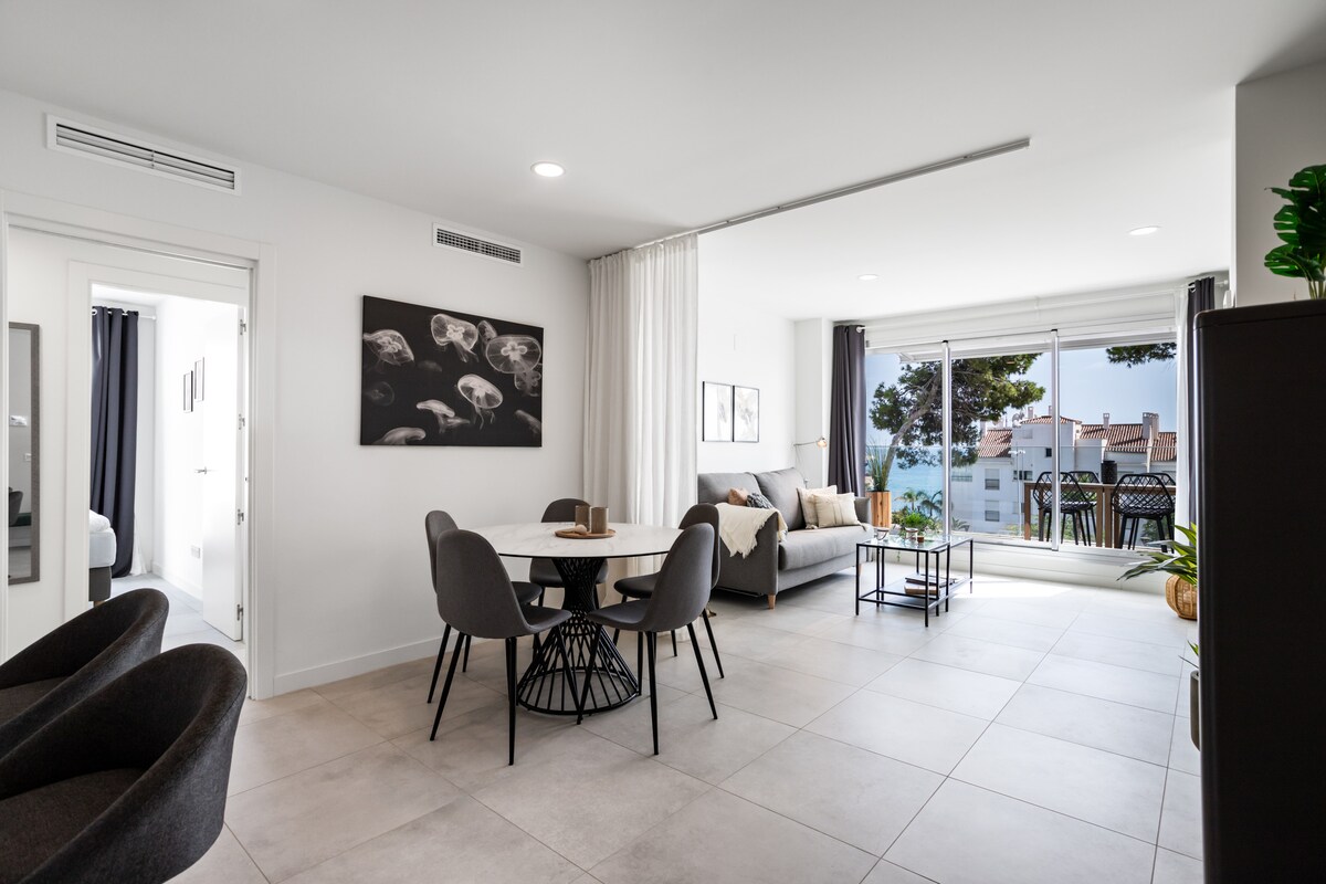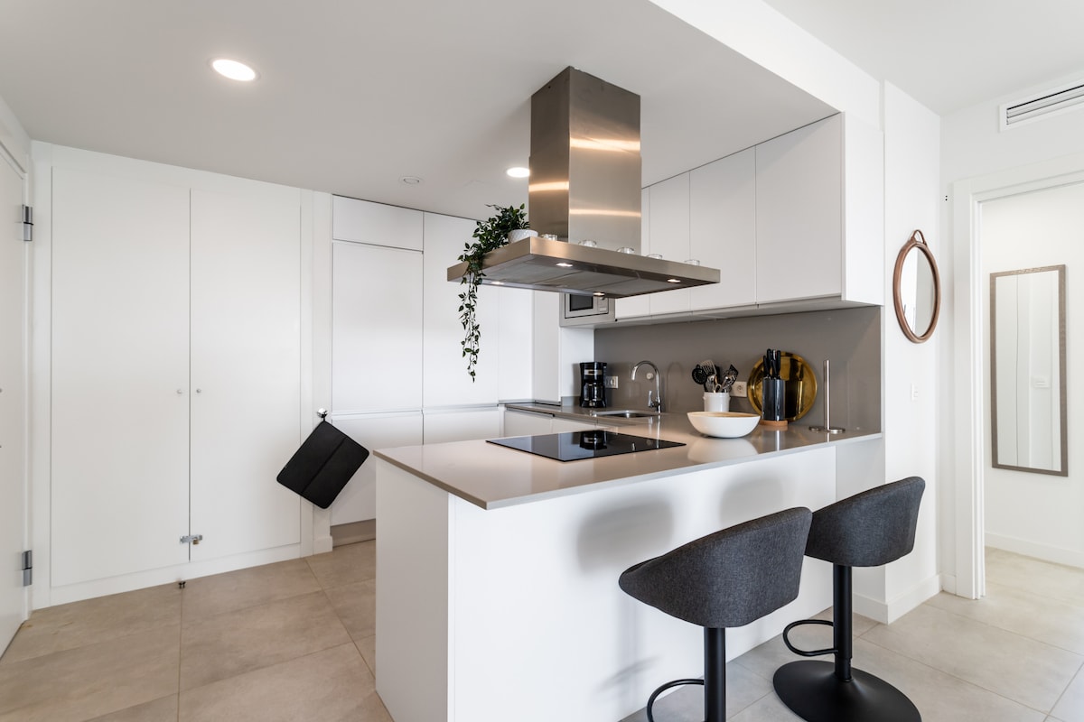 Torrequebrada is a quiet and hidden gem between Benalmadena harbor and Fuengirola with tropical beaches and cool restaurants like Las Yucas (a short walk from the apartment), Trocadero, Tulum, Gecko beach shack among others. There is also a small supermarket nearby where you can buy the essentials and several larger grocery stores 5 minutes away by car. For those who like to play golf, Torrequebrada golf is just around the corner and it is one of the coast's most popular courses.When you step through the door, you are greeted by a stylishly furnished apartment with an open plan, you have the fully equipped kitchen on the left with dishwasher, fridge and freezer, microwave, toaster, coffee maker and everything you need to cook on holiday.