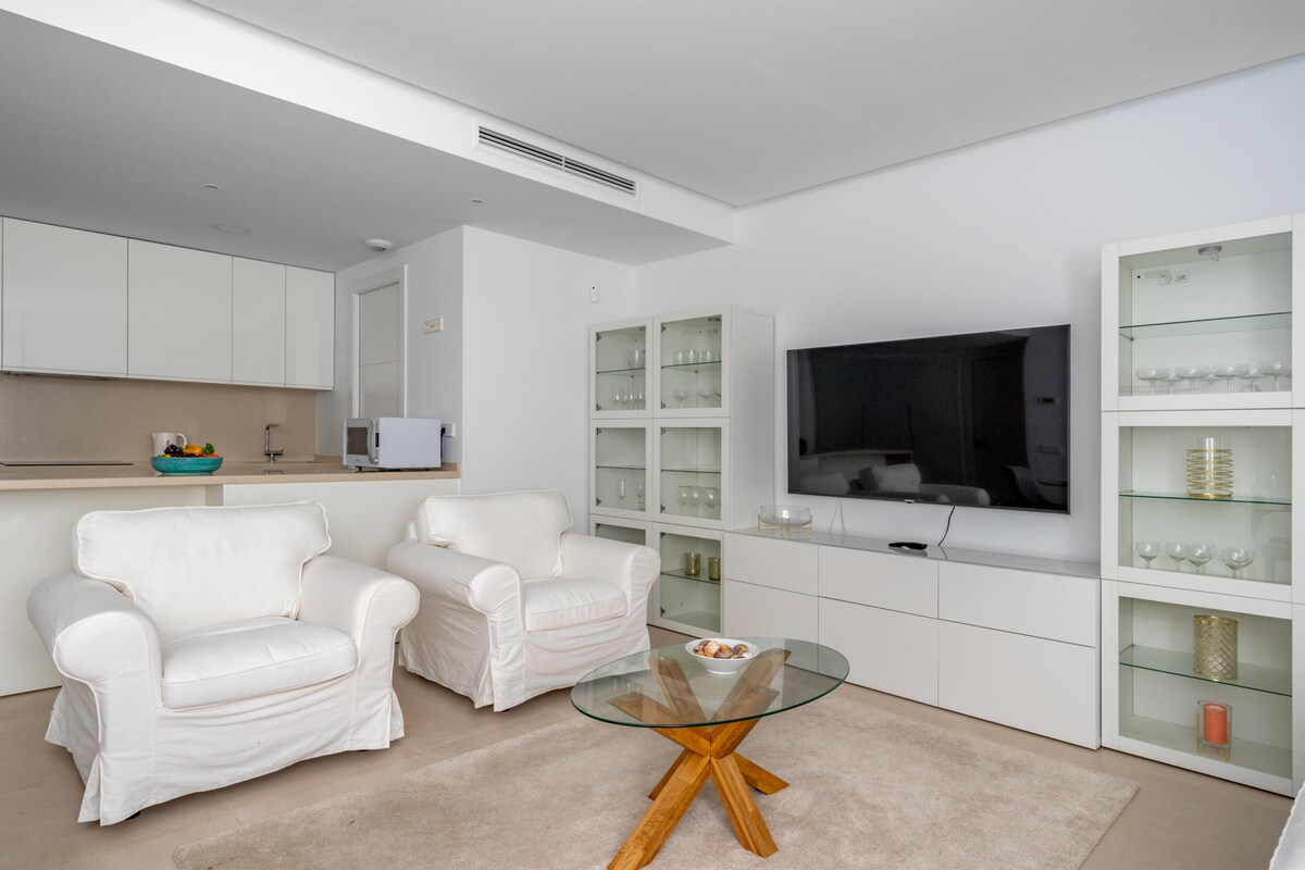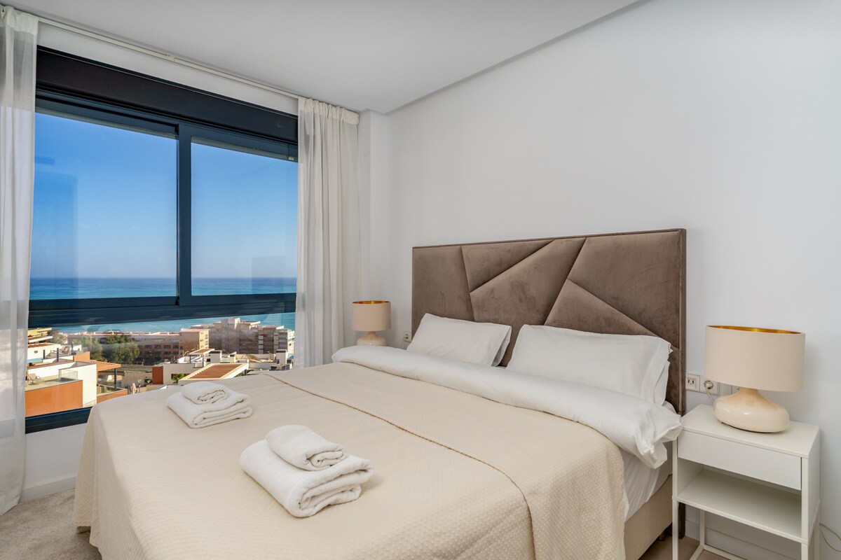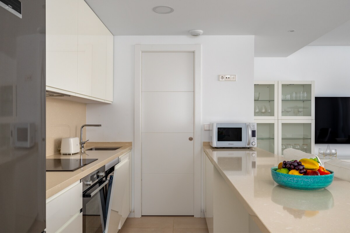 When you step in through the door, you are greeted directly by the open floor plan and the wonderful view of the Mediterranean from the terrace. To the left is the fully equipped kitchen with dishwasher, large fridge and freezer, Micro, Coffee maker, toaster and much more.Further from the kitchen there is a large dining group for 6 people and a comfortable sofa group with a Smart TV. From here you come out to the large terrace facing south with sea views and sunrise. Here you have a nice lounge group and a dining group for dining and hanging out outdoors.