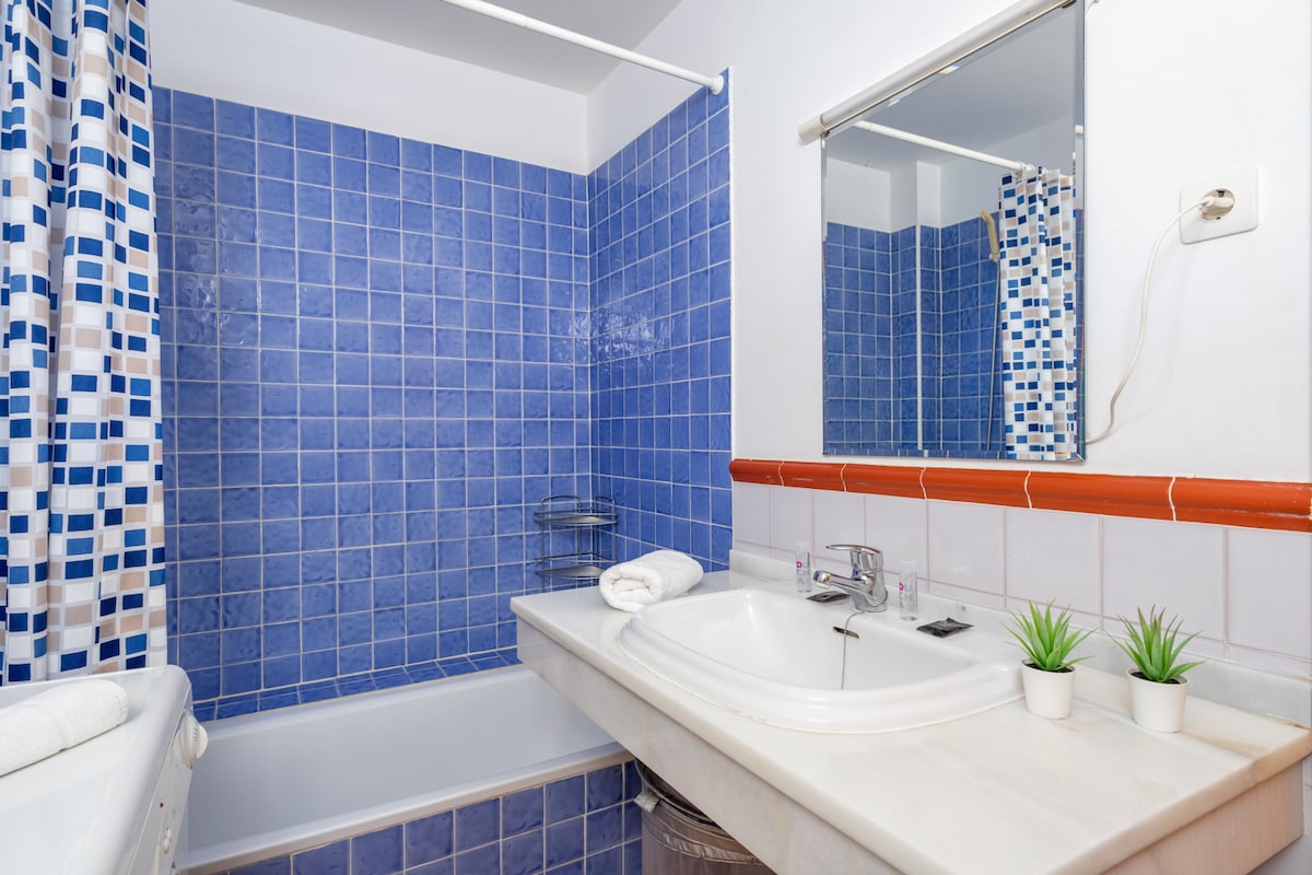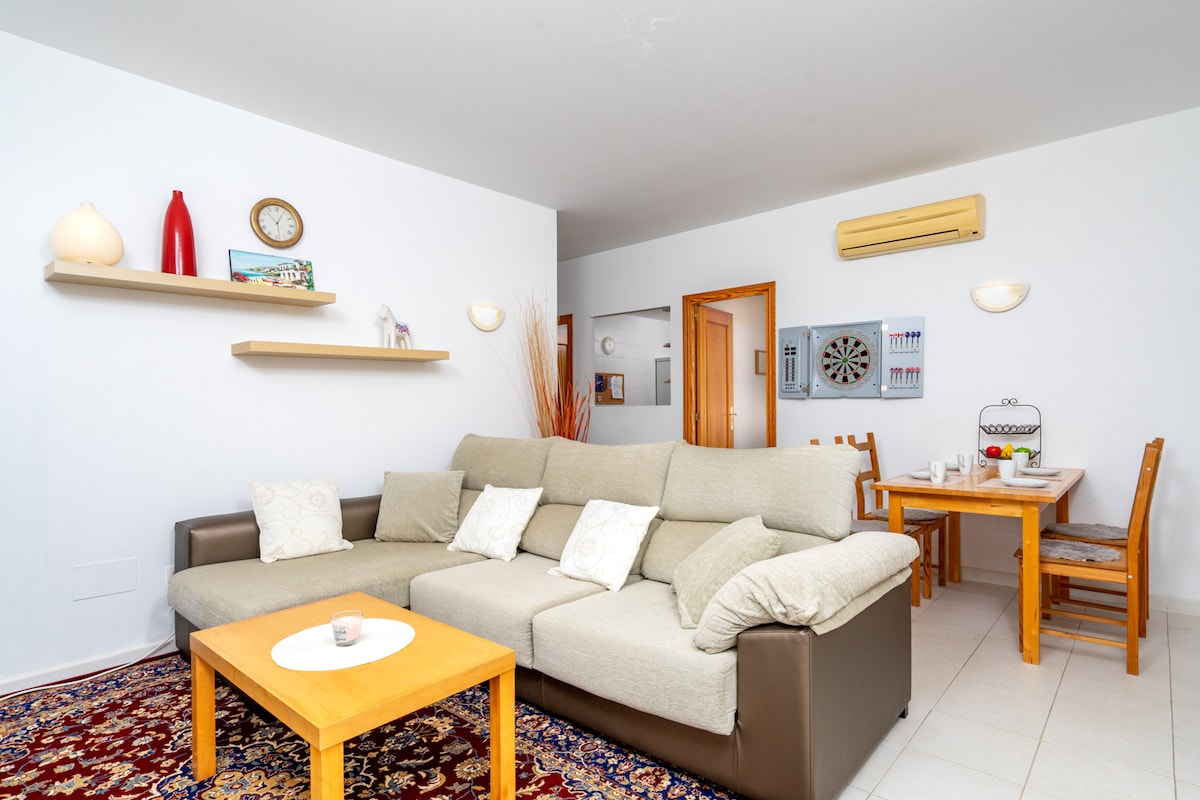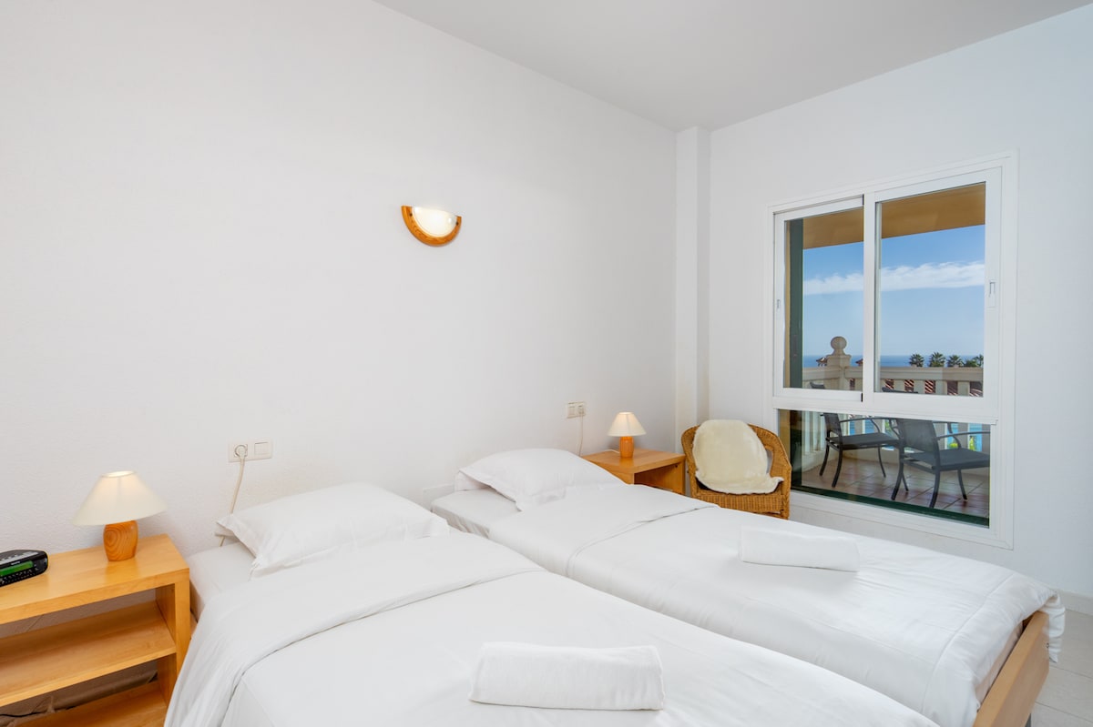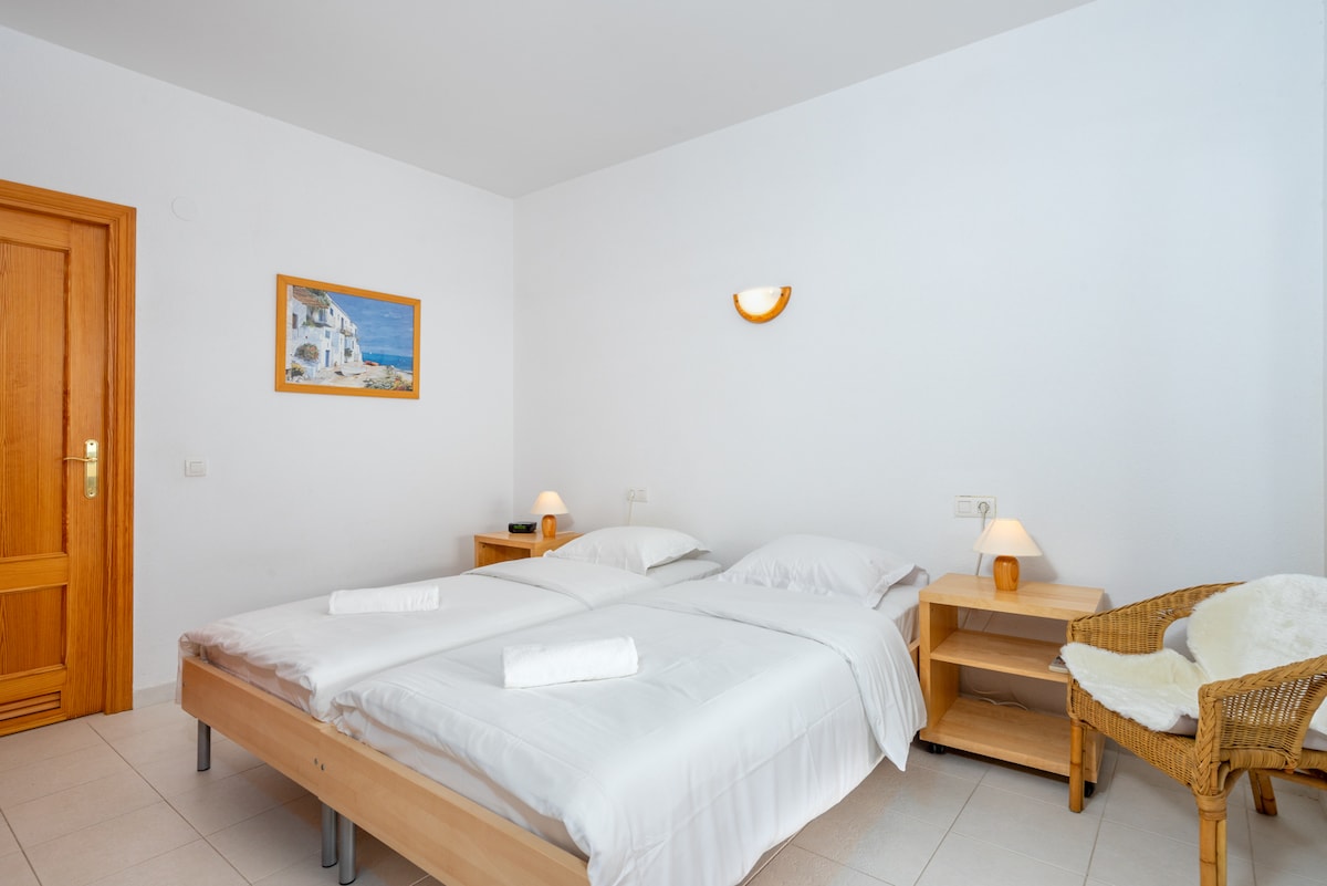 As you step into the apartment you will be greeted by a bright hallway with the fully equipped kitchen to the left with a dishwasher, fridge and freezer, coffee machine and much more. Straight ahead you have the large living room with a large and comfortable sofa, 55 "smart TV with 200 international channels, 2 lovely balconies with a breathtaking view of the area and the Mediterranean.Masterbedroom has a double bed and ensuite bathroom, ensuite as well as A / C with cooling and heating, the second bedroom has 2 single beds as well as storage and A / C with cooling and heating.