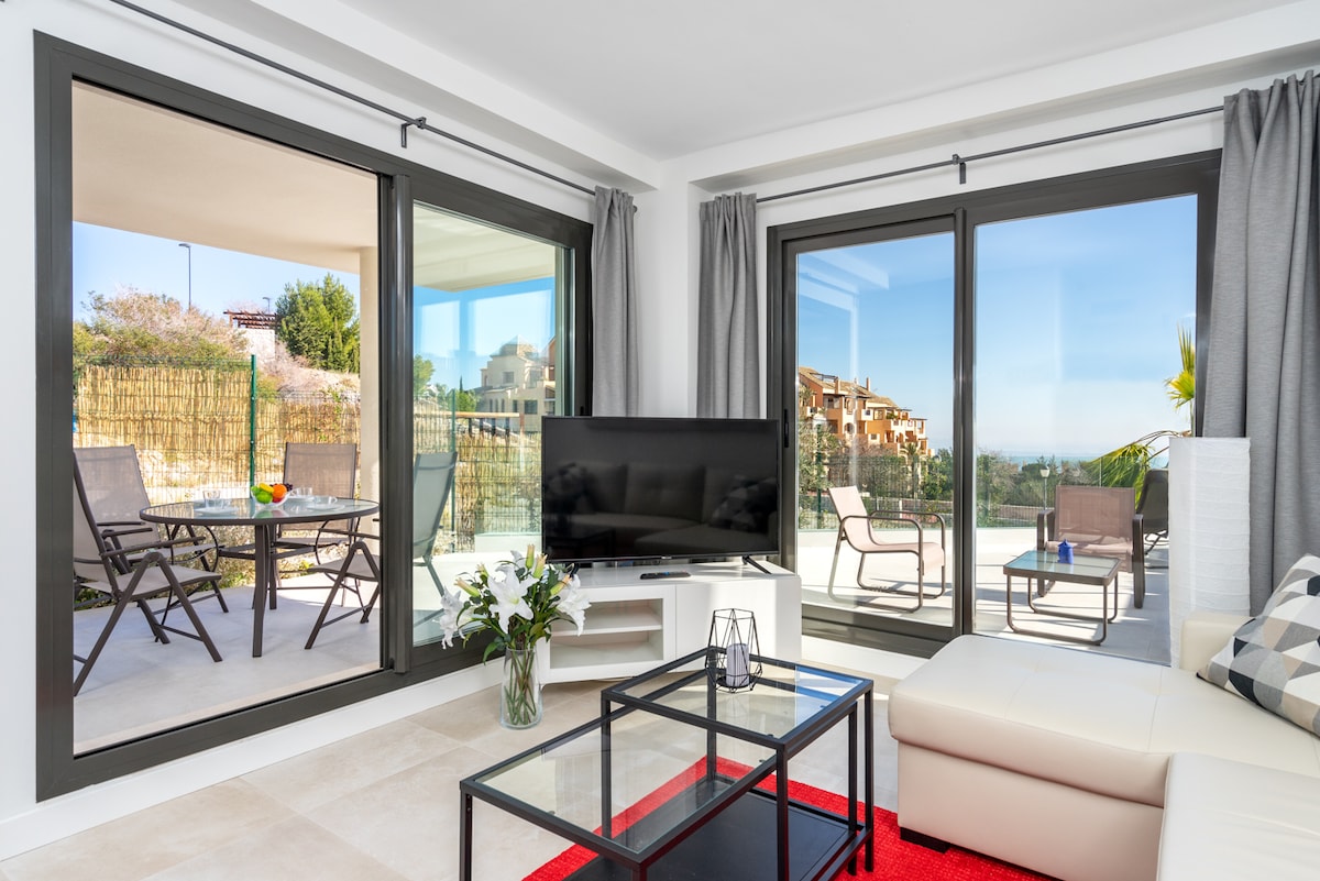 As you step into the apartment you are greeted by a wonderful, green, view from the large windows and private terrace, social and open plan living with dining area, sofa, 4K smart TV with international channels and a fully equipped kitchen with dishwasher, washing machine, fridge / freezer, coffee maker, toaster and much more.Masterbedroom is equipped with a large and comfortable double bed and its own ensuite bathroom with shower and a balcony.