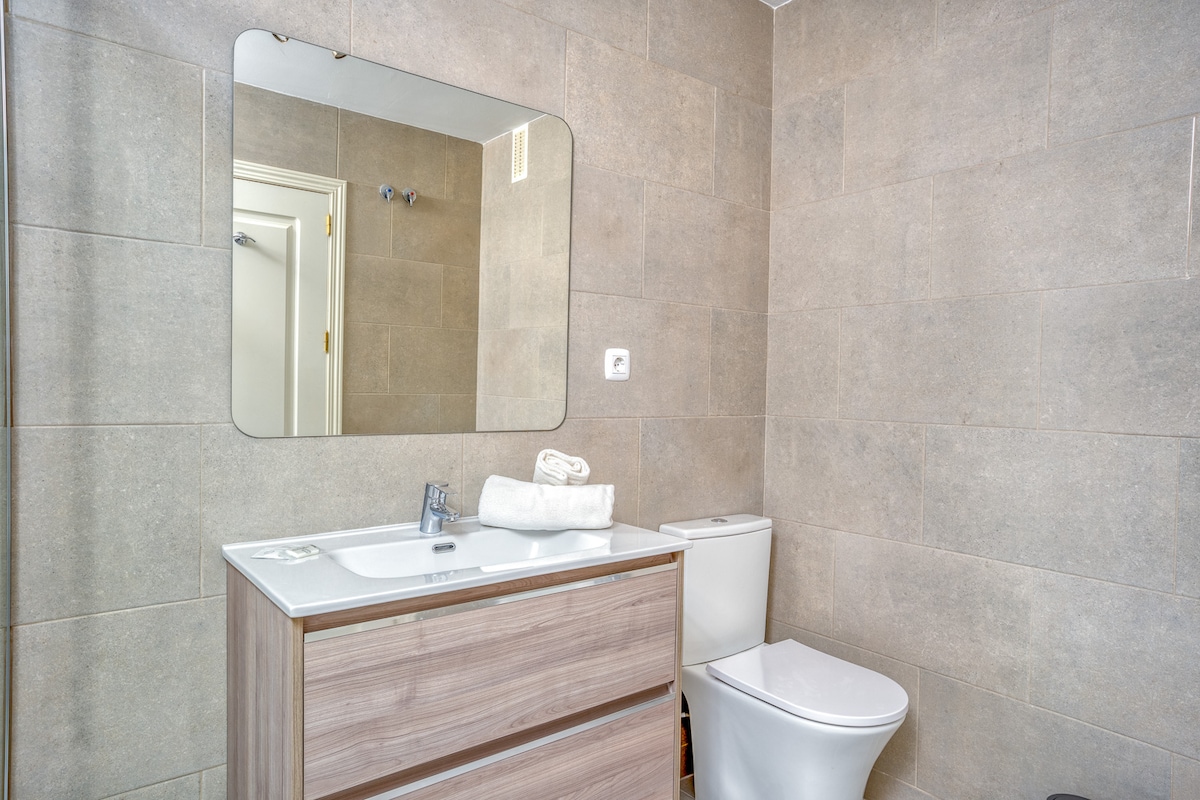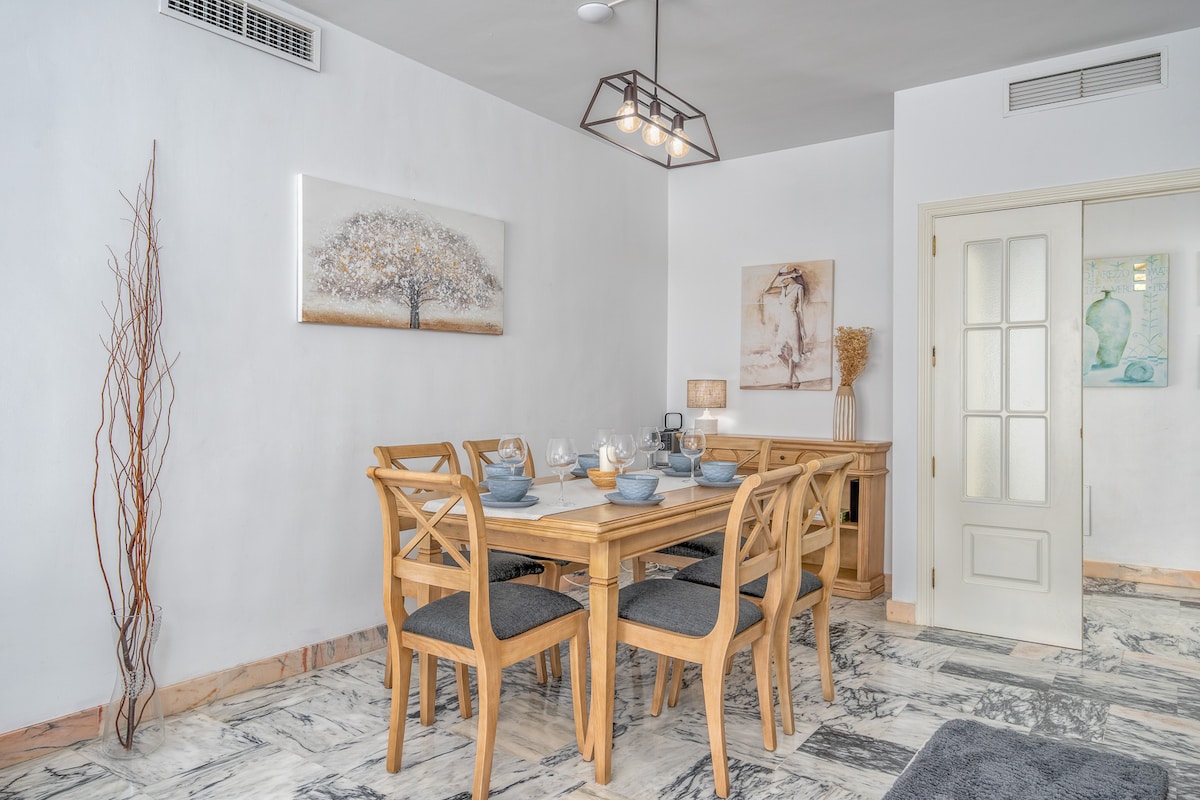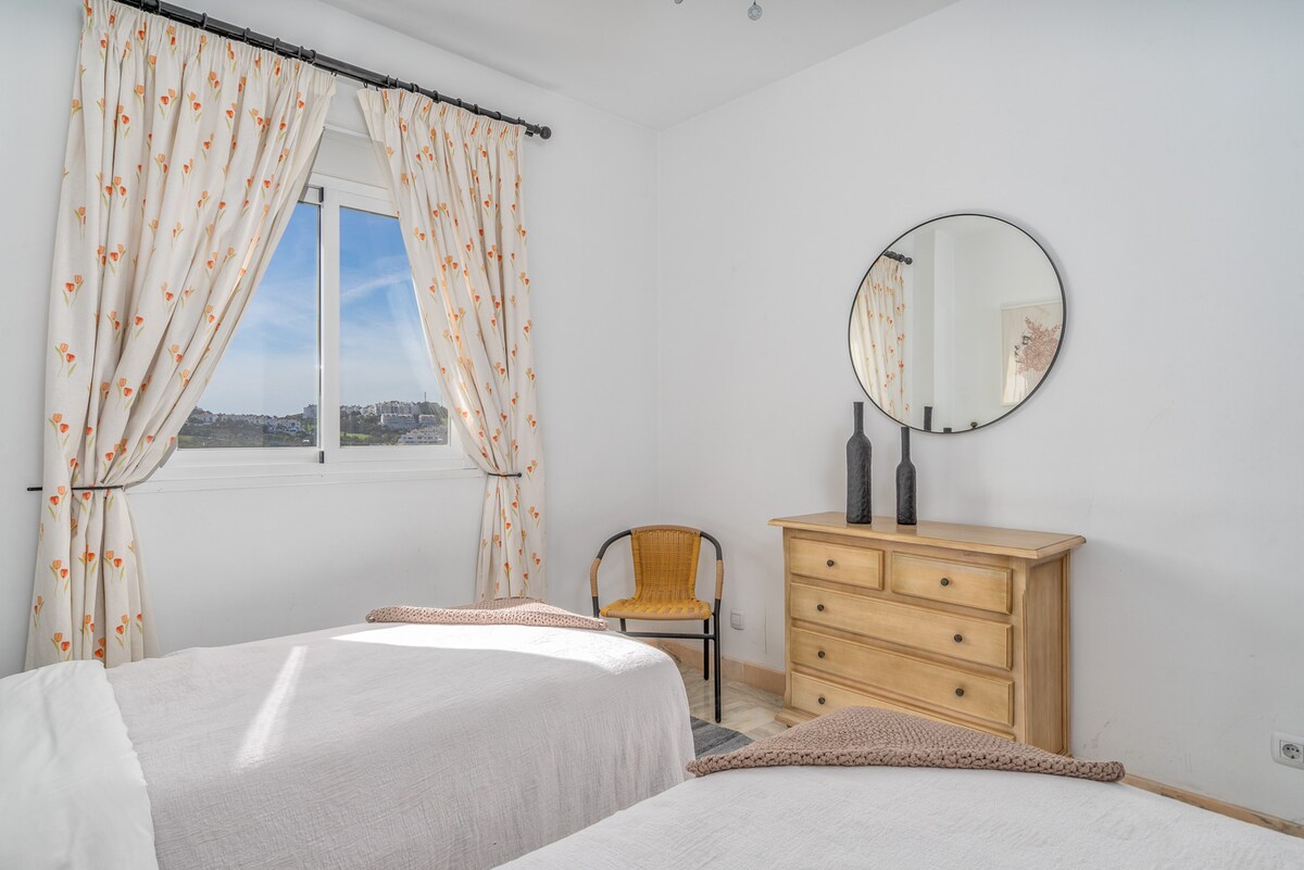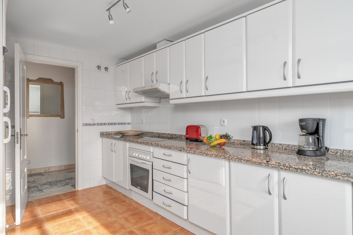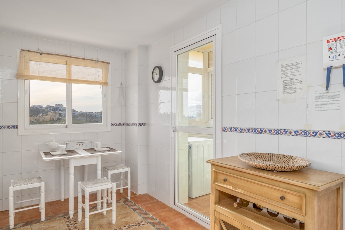 When you enter the apartment you are met by a cozy apartment with the living room directly to the left, here you have a dining area with seating for 6 people, a comfortable sofa and a Smart TV, further you have a cozy balcony overlooking La Cala de Mijas and the Mediterranean as well as a comfortable seating area.The large kitchen is fully equipped with dishwasher, kettle, coffee maker, microwave and everything you need to be able to cook on holiday.