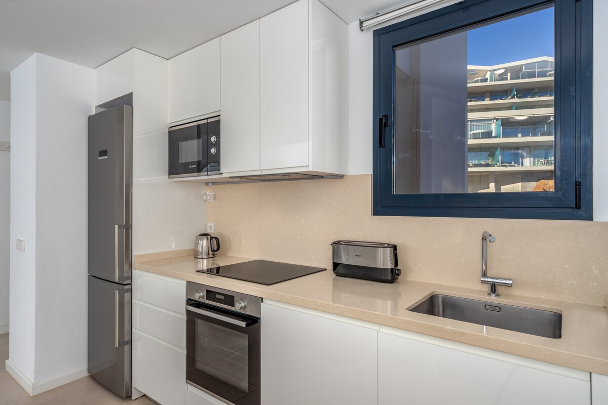 Stepping into the penthouse, you’ll be greeted by a bright and open floor plan. On the left, the fully equipped kitchen features a coffee maker, kettle, large fridge and freezer, dishwasher, and all the essentials needed for cooking during your stay. A breakfast bar with two high chairs provides a cozy spot for morning coffee.