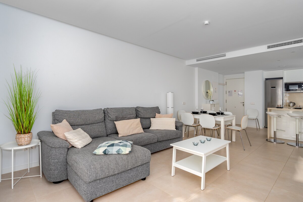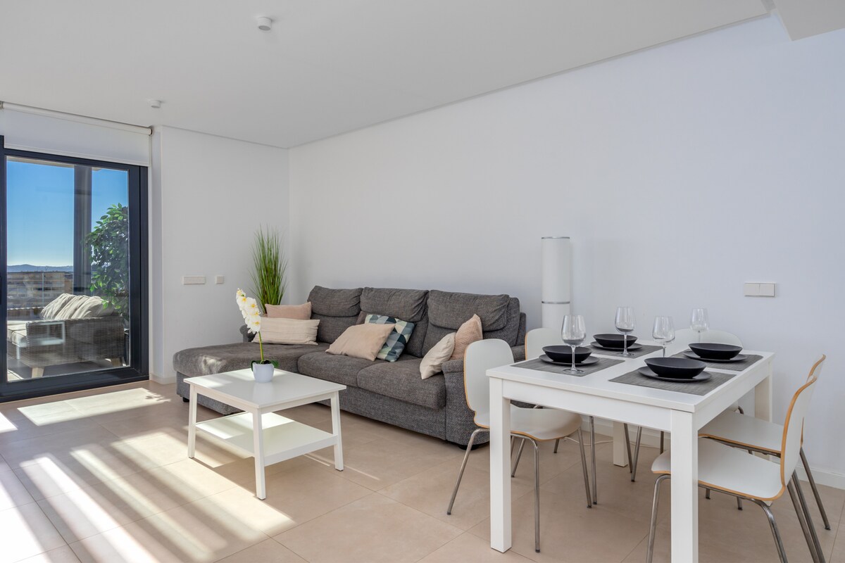 The living room offers a spectacular sea view, a dining table with seating for eight, and a spacious corner sofa that doubles as a sofa bed, positioned in front of a large Smart TV.