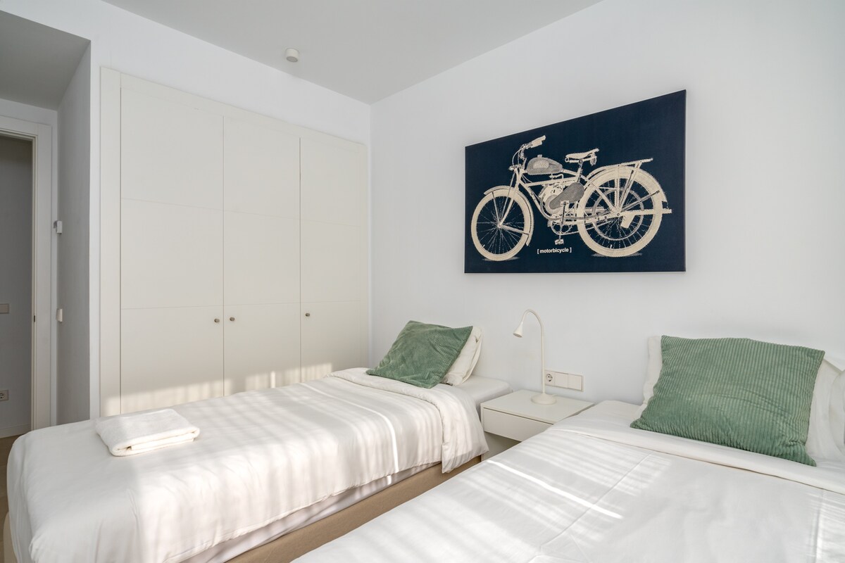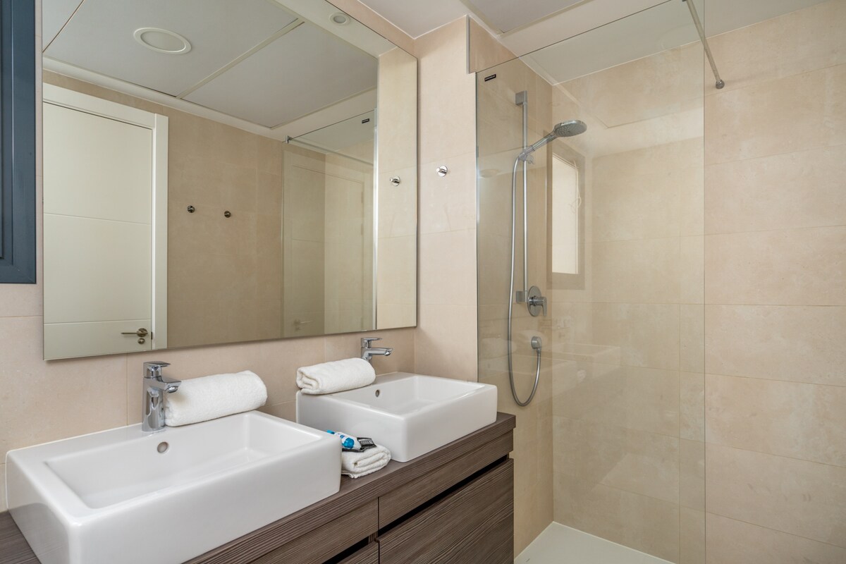 The apartment has three bedrooms. Two bedrooms each have two single beds and share a modern bathroom, while the master bedroom boasts a double bed and a private ensuite bathroom with both a bath and shower.