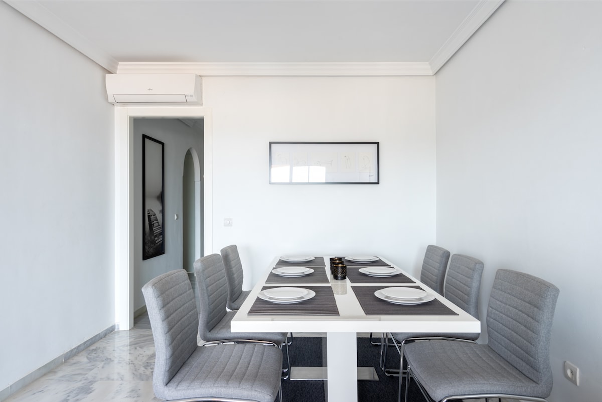 Accommodation exceeded our expectations. The apartment is impeccable, with spectacular views of the golf course and the Mediterranean Sea. The apartment is fully equipped, with air conditioner in the two bedrooms and the living room. The kitchen was spotless, with all the utensils available. Highlighting the cleanliness that was comparable to a top notch 4/5 star hotel. We liked the location not being in a quiet place, where it was easy to park and the beach was only a 10-minute drive. We will definitely repeat when we return in Malaga.