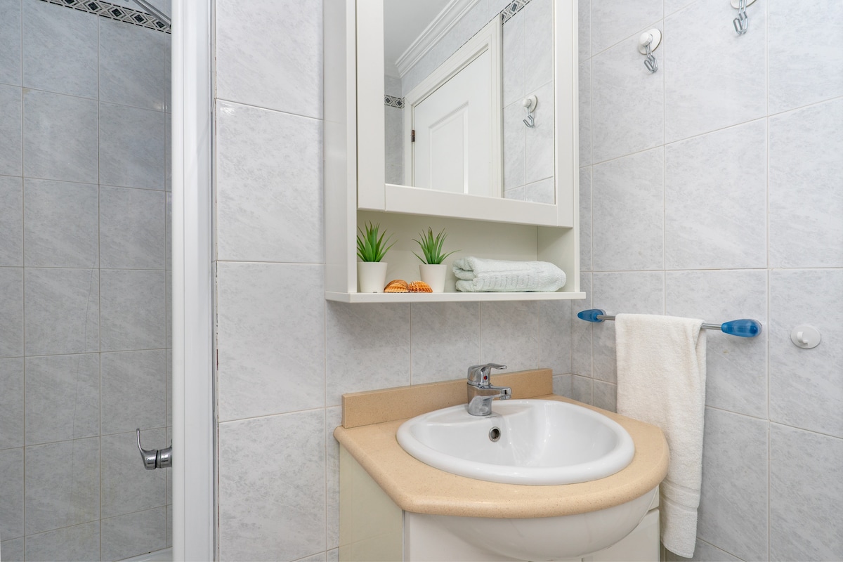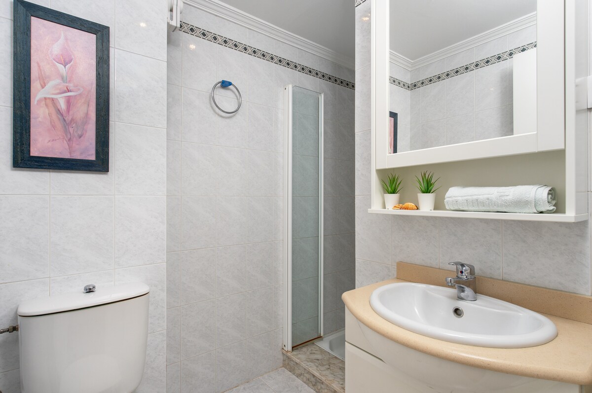 Lovely big peaceful terrace got the sun all day, nice big comfortable beds, everything you need was at hand to make it feel a home from home. Could do with a couple of hand rails to help getting in the over the bath shower. Although there was a separate walk in shower. Was a 10 to 15 mins walk to bars and restaurants. Slightly downhill on way out so slightly uphill on way back. 20 to 25 mins to benalmedina marina or carihuela beach with all the lovely beach restaurants. Overall a very pleasant stay