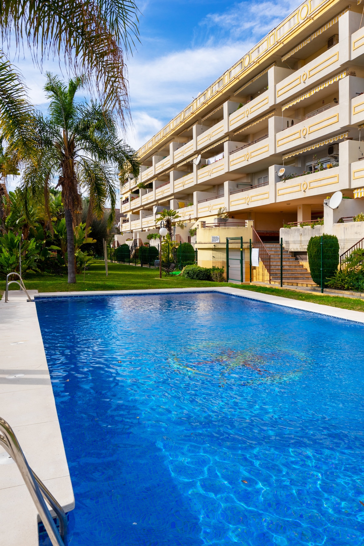 Apartment was nice and spacious. But the small details were not perfect. Kitchen is poorly equipped eg. no wine bottle opener or functioning frying pan. Dishes were dirty when arrived and no washing up liquid. After asking got one dishwasher tablet. And as it is said, the courtesy set is only for the beginning. So you have to buy everything yourself: toilet paper etc. Apartment is neat, although a bit outdated. Air conditioner was making a loud noise on the balcony and it sounded like it needed repair. Doorphone recorded all the sounds from the apartment and played them at the gate even though it was turned off. Everyone on the street could hear us talking inside. So no privacy at all. Was fixed after a couple of days. The pool is nice but poorly maintained. Filter system and showers stopped working. We tried to ask the renter why, but they didn't want to solve the matter. At end of stay beware that you can't leave yard without a key if someone has locked gate to the street.
