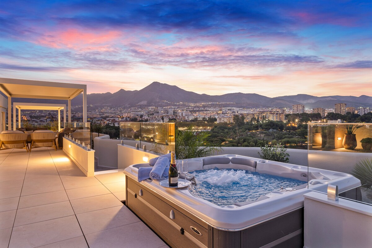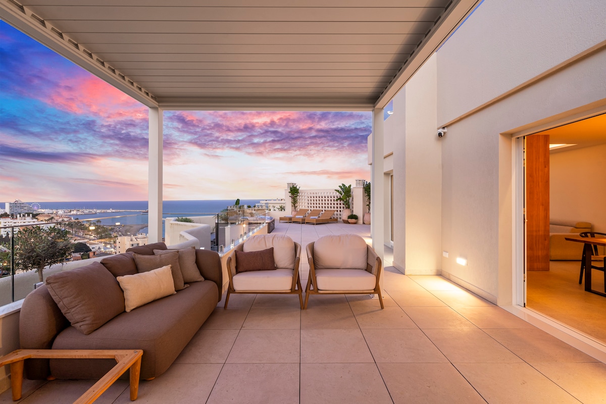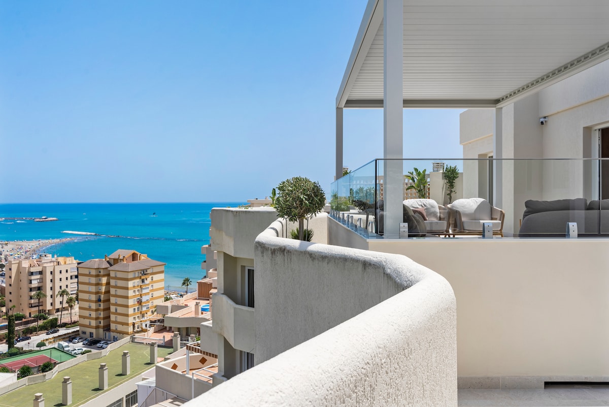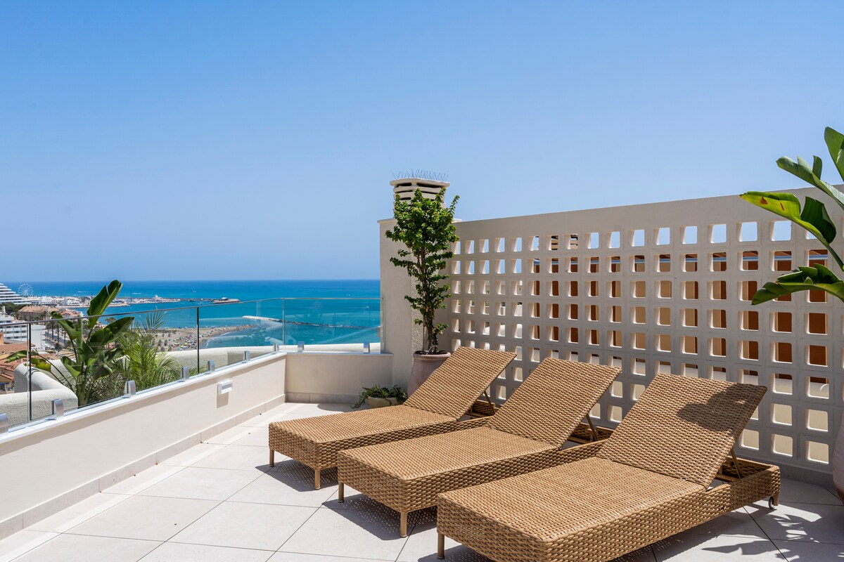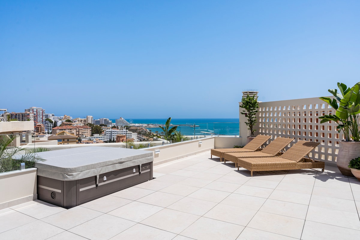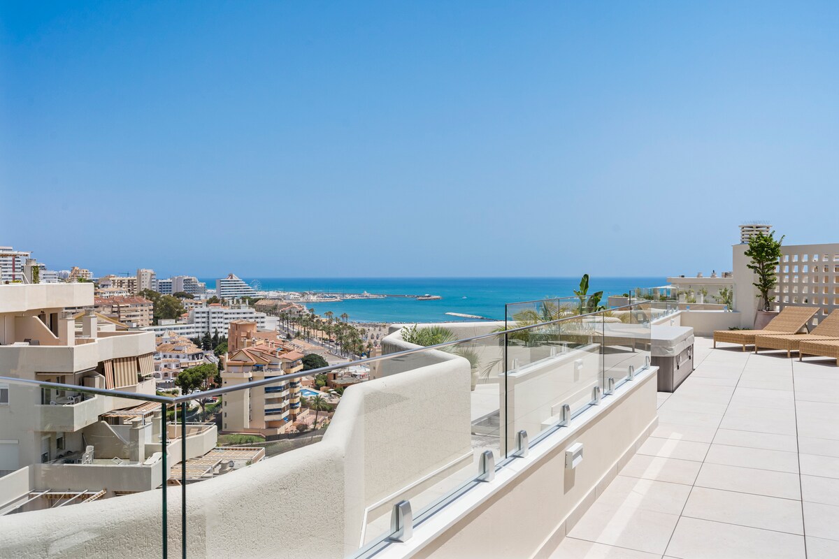 **Luxurious oasis on the coast of Benalmádena** Experience unparalleled luxury in this amazing penthouse in Benalmádena, offering breathtaking views and a serene, relaxing atmosphere. This high-finish residence features an stunning outdoor area exceeding 150 square meters, perfect for unwinding and entertaining. bask in the sun on comfortable sun beds, enjoy meals at elegant dining tables, or immerse yourself in the hot tub for relaxing moments under the stars.