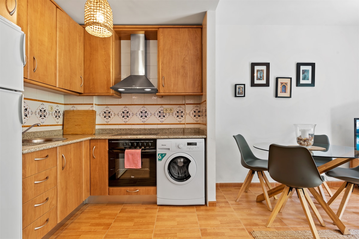 The kitchen is thoughtfully equipped with an oven, microwave, dishwasher, and a full set of dishes and tableware, perfect for preparing and enjoying meals. Added conveniences include a washing machine and a lovely balcony where you can enjoy the fresh sea breeze while sipping your morning coffee or a relaxing evening drink.