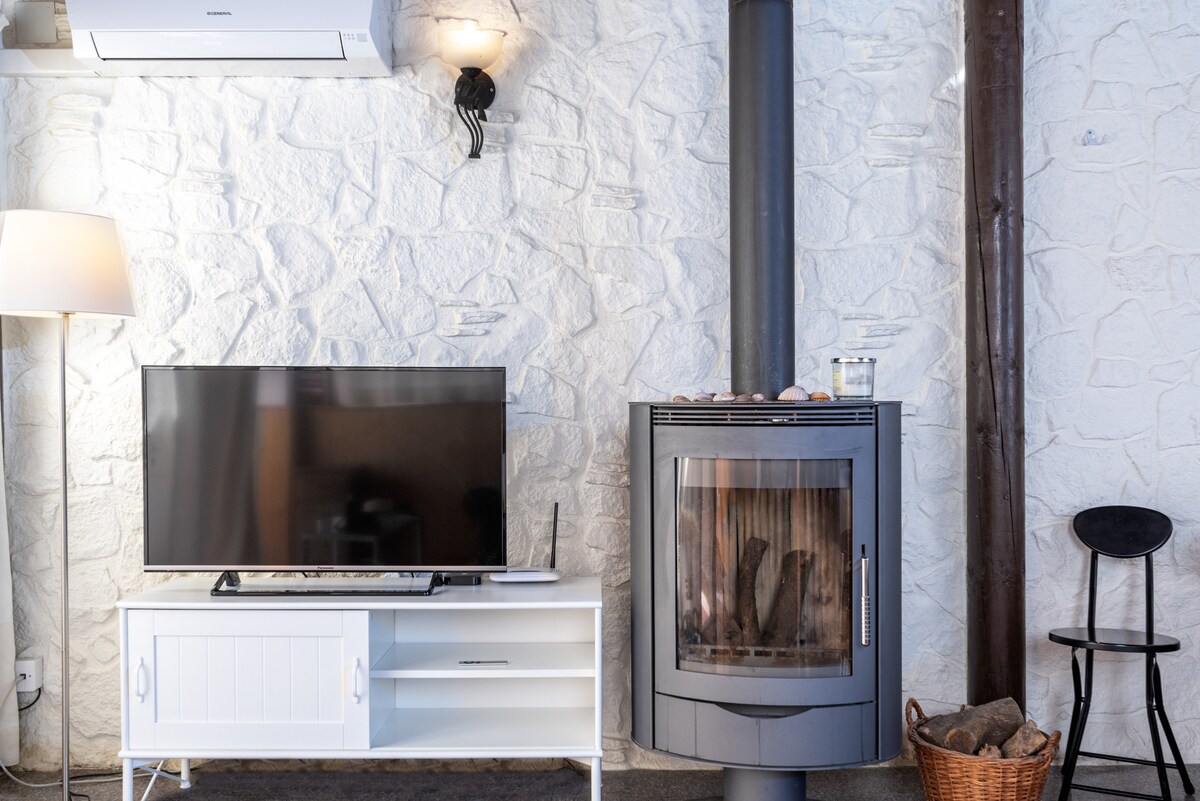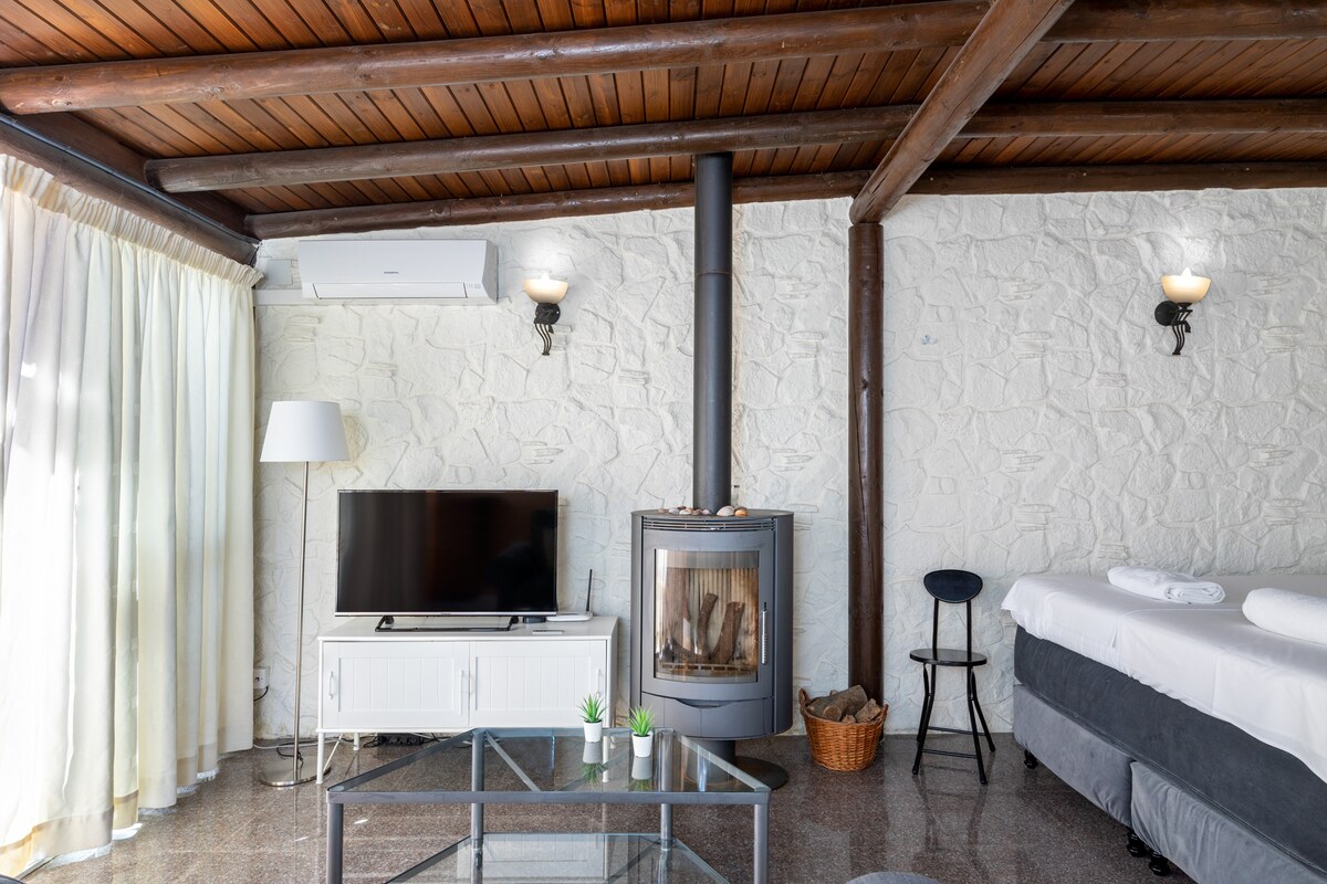 The apartment consists of a larger living room with bed, sofa and TV as well as a fireplace (for visibility) and a newly renovated bathroom with shower also direct access to the large roof terrace that takes you all the way around to the fully equipped kitchen as well as the dining room.