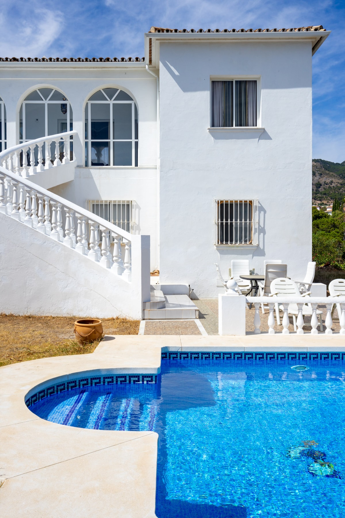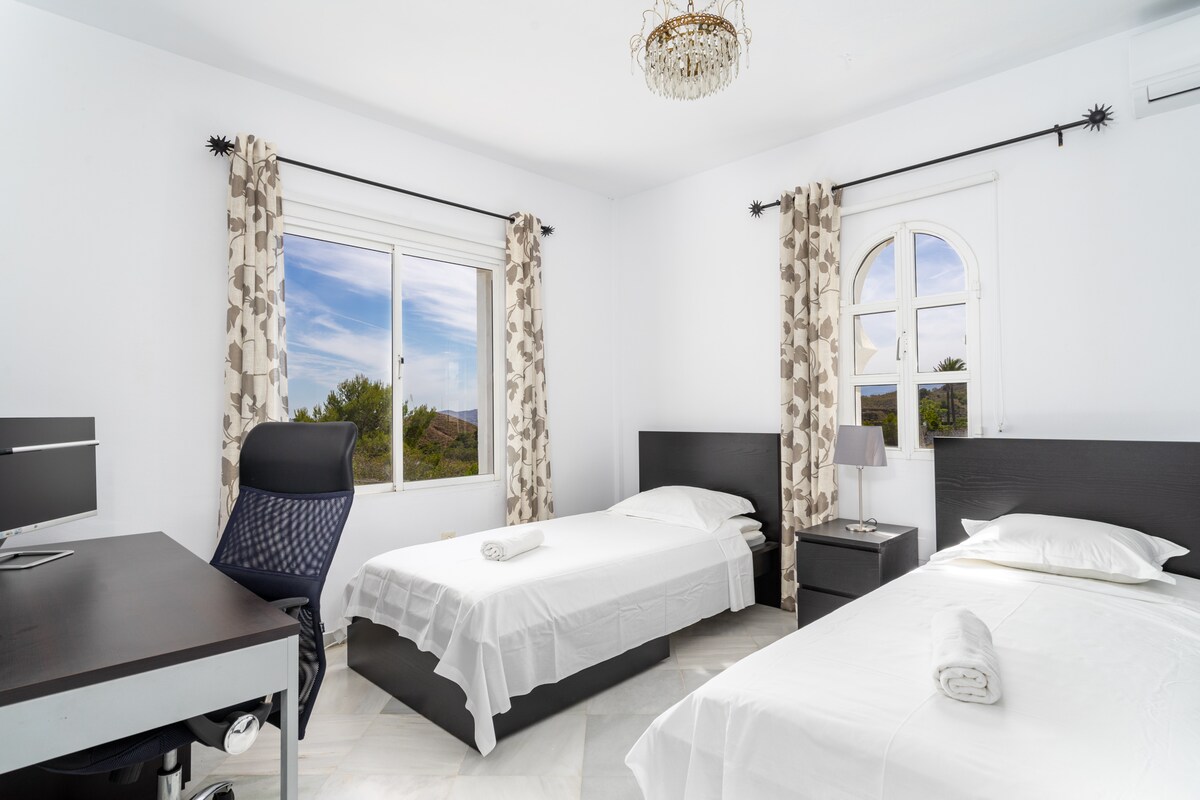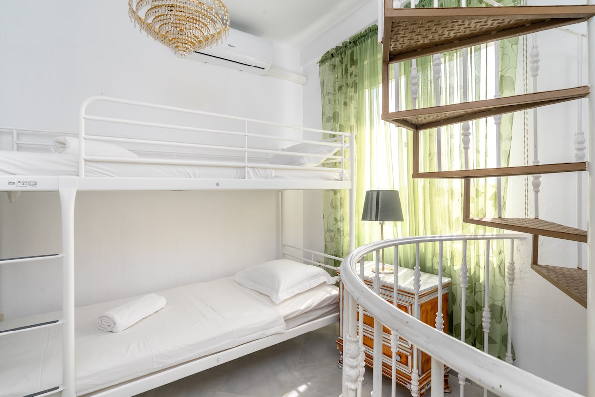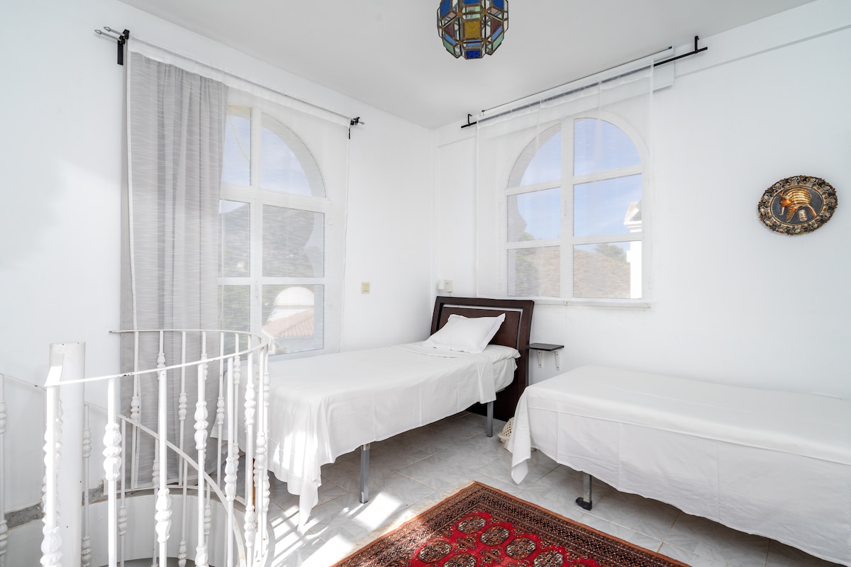 Further to the left is the fully equipped and large kitchen with a magnificent view of the mountains and the Mediterranean Sea, the kitchen is fully equipped with a dishwasher, stove and oven, fridge and freezer, coffee maker, toaster, microwave and much more. The conservatory between the garden and the living room is a place where you can relax and just look at the view before going down to the shared pool and garden. The pool and garden are shared only with one apartment, there is a barbecue area and several sunbeds. There are 4 bedrooms, one bedroom with a large double bed, the second bedroom with 2 single beds, the third bedroom with a bunk bed and upstairs is the fourth bedroom with 2 single beds and a private roof terrace. There are 2 large bathrooms with bath and shower. The house is otherwise fully equipped with A/C in every room, WIFI, flat screen TV, dishwasher and washing machine and much more. There is an inhabited apartment on the ground floor with a separate entrance that only shares the pool area and garden. The cleaning fee includes bed linen and towels in one set per person.Pool towels are available for rent, contact us for the price. Baby Package €39: including cot and high chair, on request and subject to availability. The courtesy set is provided only for the beginning and not for the entire stay.Pools have very different opening times, please inquire before the booking to make sure the pool is open during your stay.
