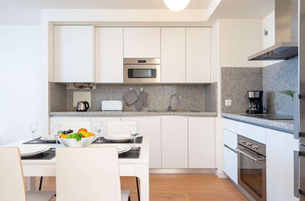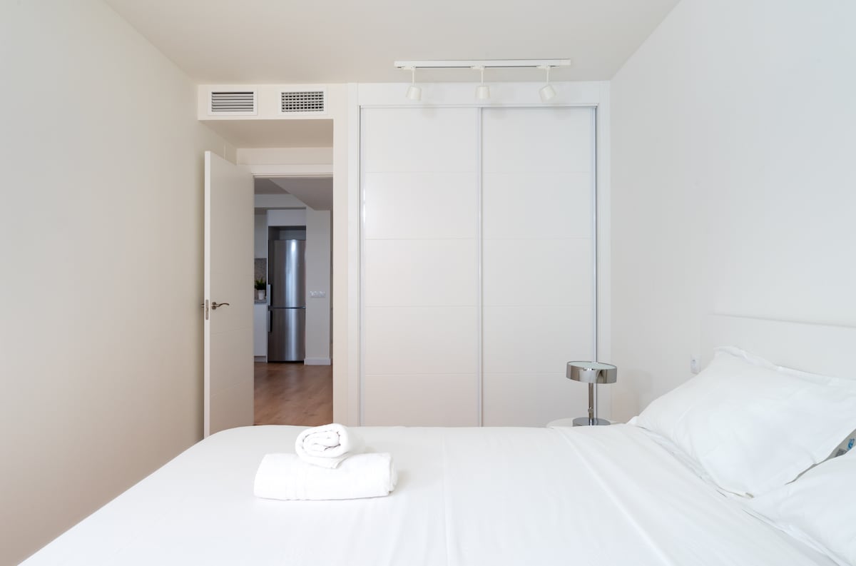 When you step into the apartment you will be greeted by the wonderfully open floor plan between the kitchen and the living room, the kitchen is fully equipped with a dishwasher, large fridge and freezer, coffee maker, toaster and everything else you can think of that you need on holiday, the living room is equipped with a large Smart TV with international TV channels and a sofa bed. From the living room, you also have access to the private balcony with sea views. From the front door you have to the left a large bathroom with shower and double sinks, straight from the front door is the bedroom which offers a nice double bed, each night lamp and storage in the large closet and its own French balcony.The apartment is otherwise fully equipped with central A / C in all rooms, Washing machine, Dishwasher, Smart TV with international channels, Fridge and freezer, cooker and oven etc.