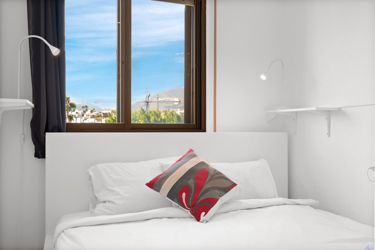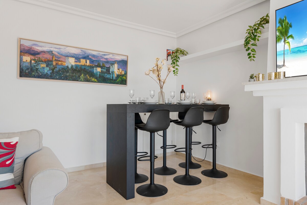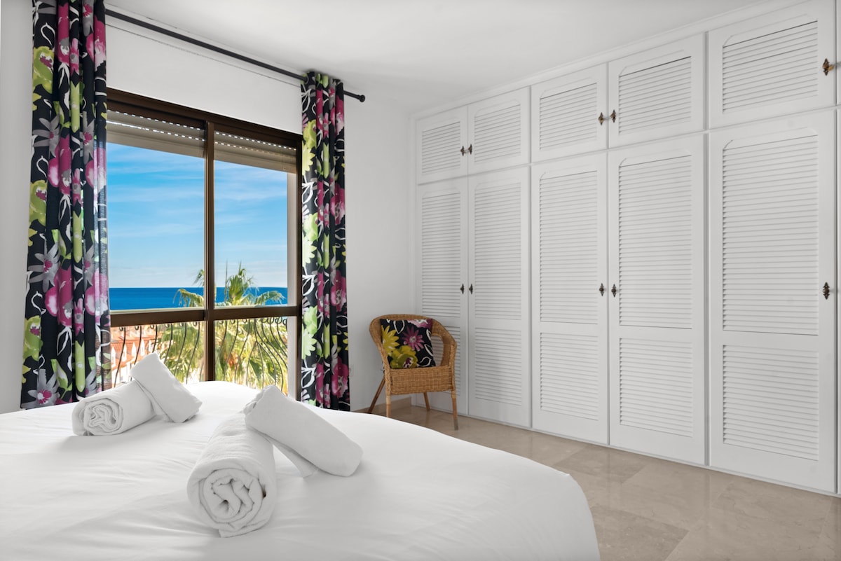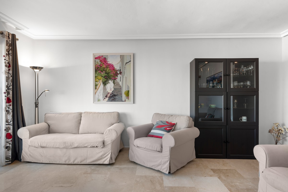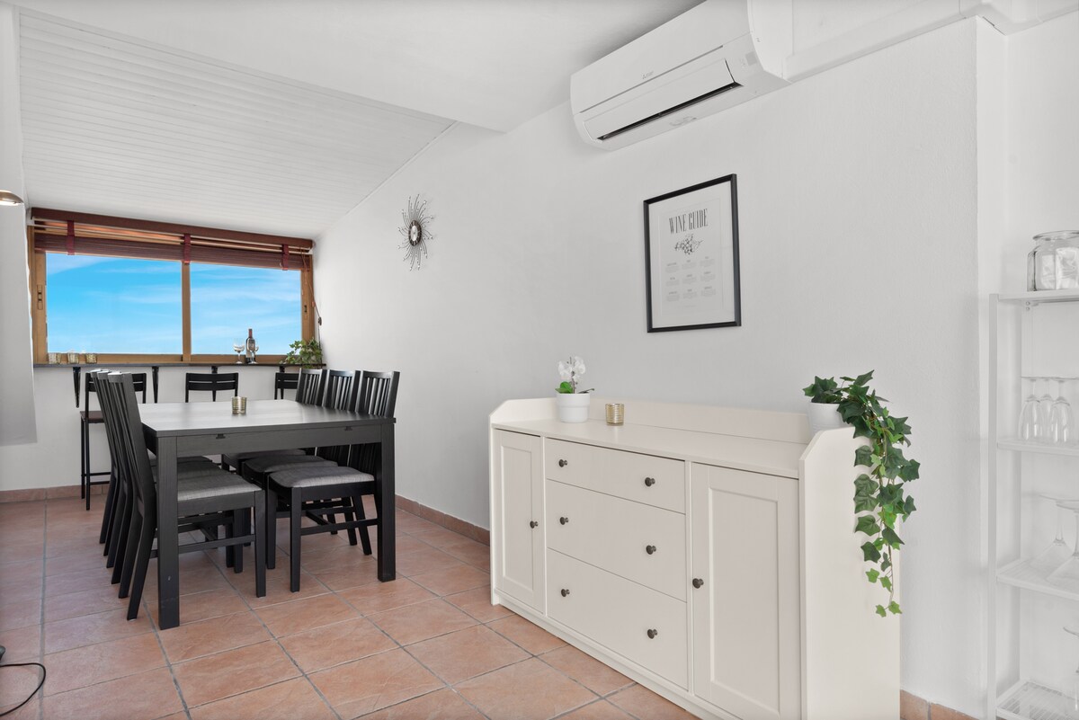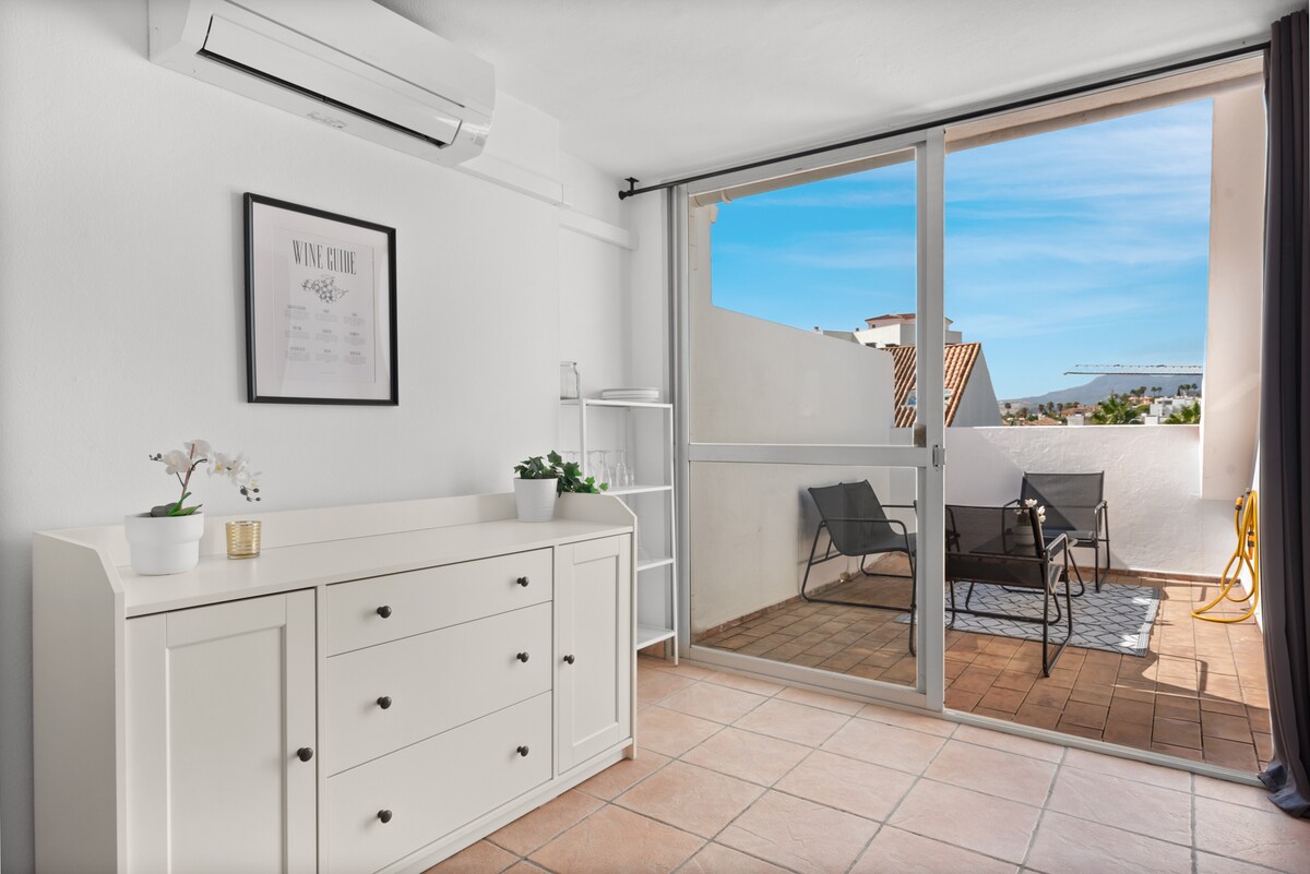 The area around the apartment is a quiet residential area with only 500m to Puerto Estepona (harbour) and 400m to Playa del Cristo which is a popular beach with lovely beach restaurants. A short walk from the apartment there is also a padel facility with 10 courts and a gym. Nearby there are also several wonderful markets every Wednesday 9-13:00 and Sundays 8-14:30 in the bullring.When you step through the door, you are greeted by the fully equipped kitchen on the left, with dishwasher, kettle, toaster, coffee maker and everything you need to be able to cook on holiday. Straight ahead you enter the spacious living room with a large smart TV, comfortable sofas and armchairs and a lovely terrace with a wonderful view of the mountains and the sea. There is also a toilet.