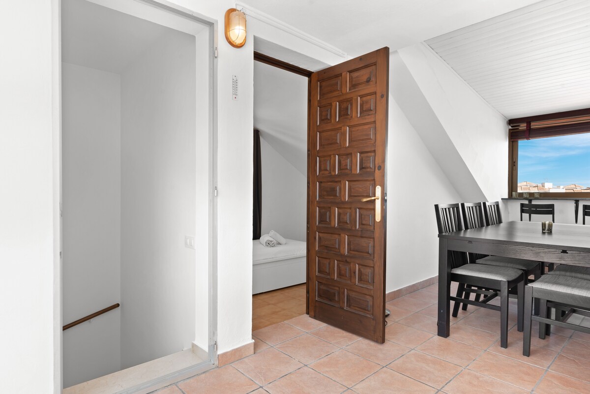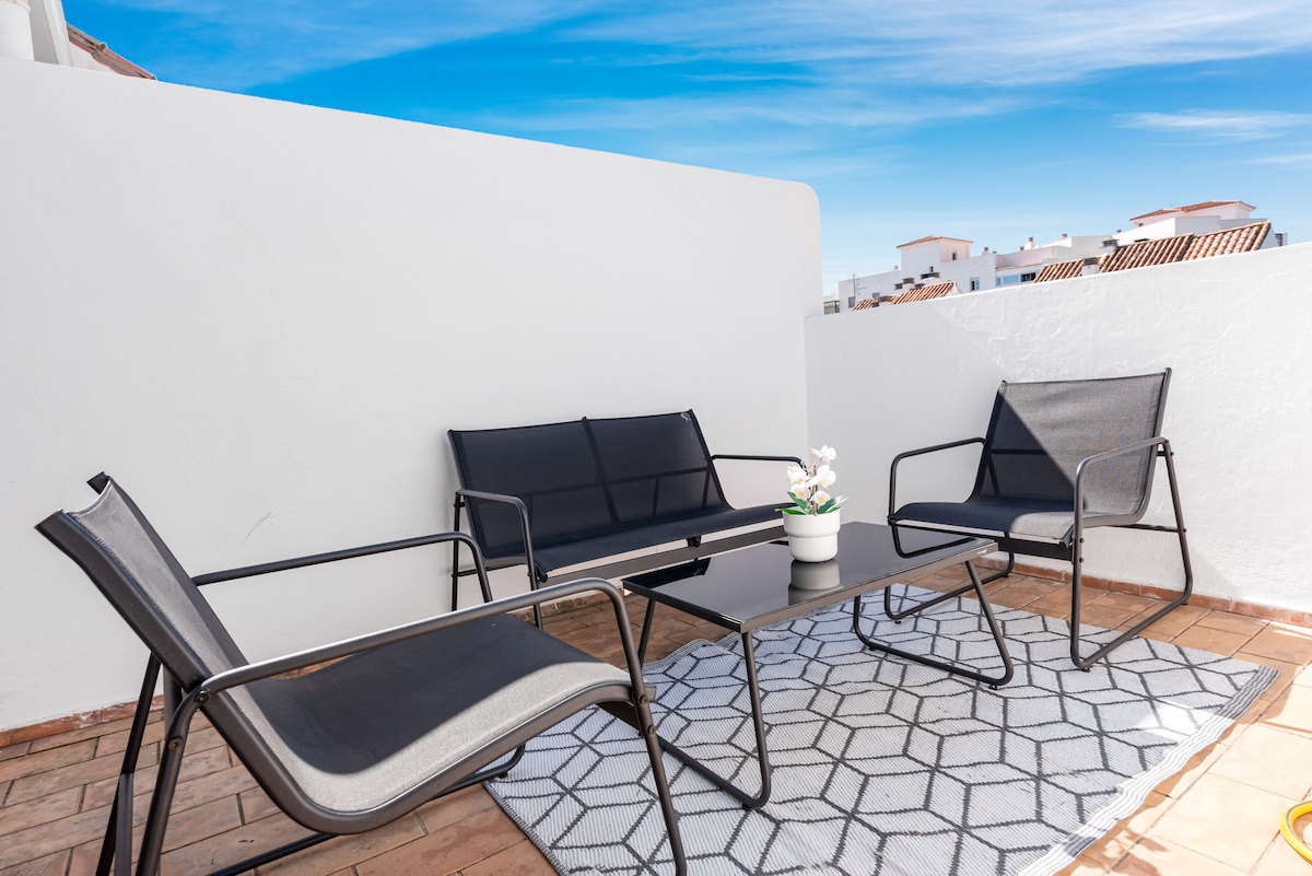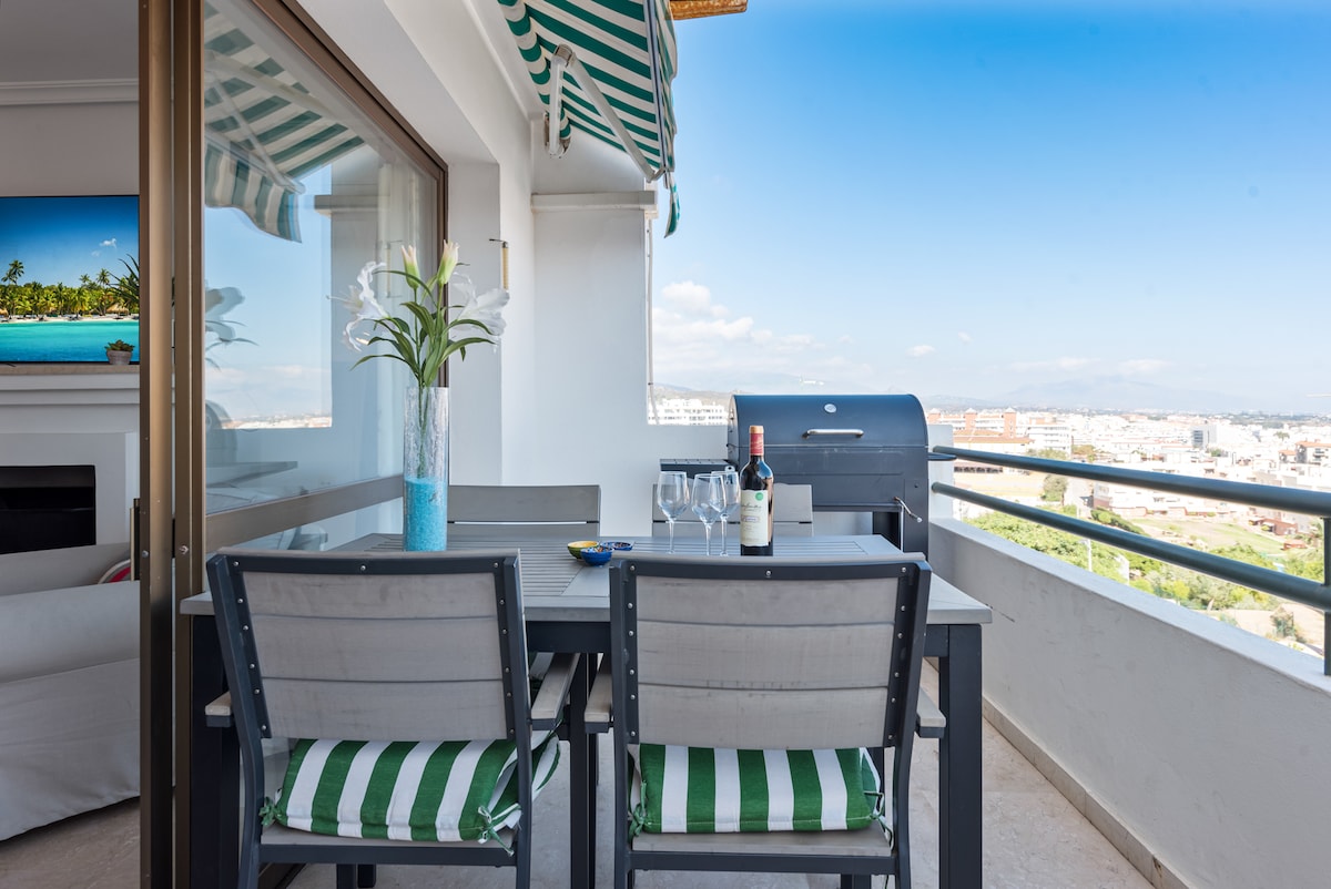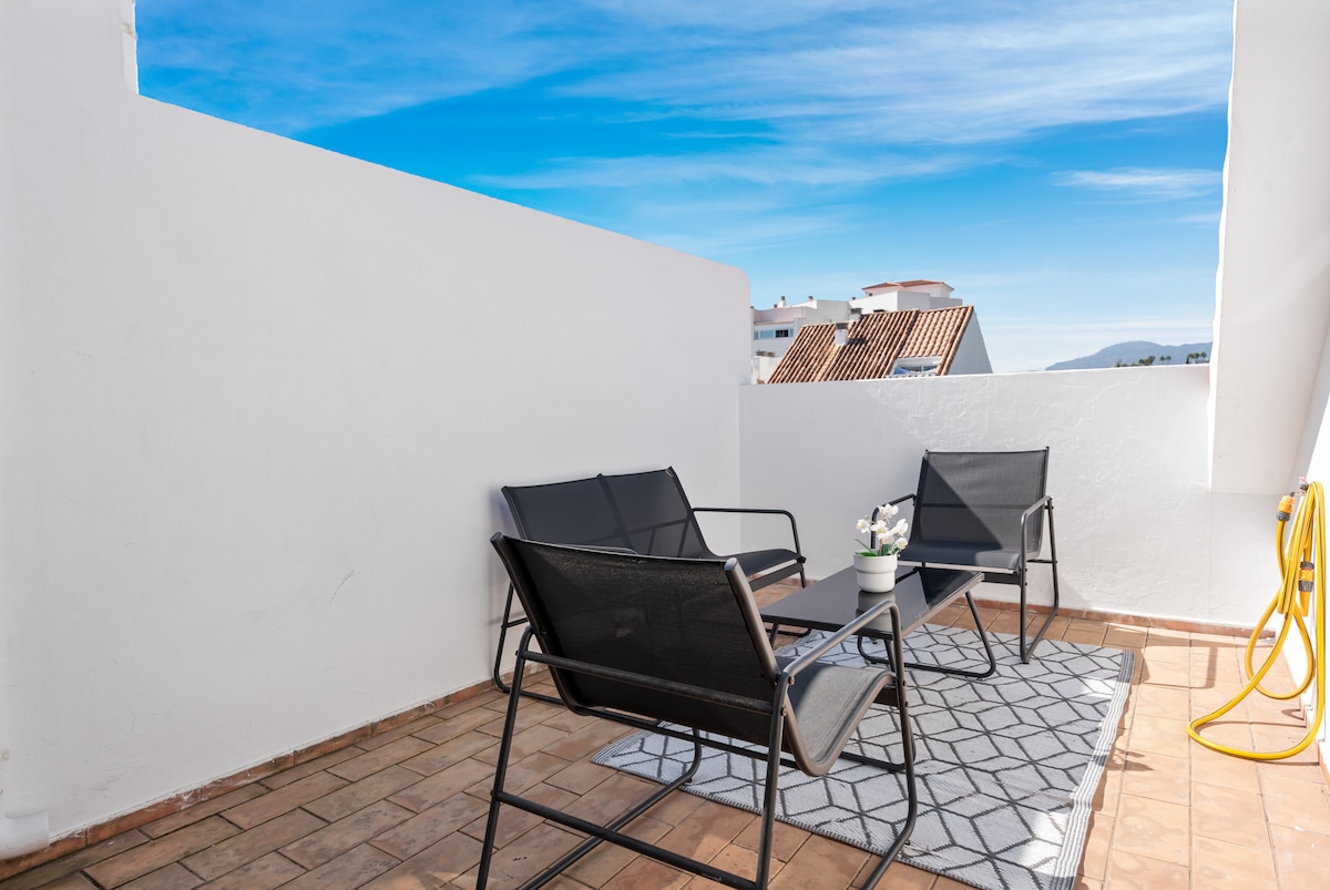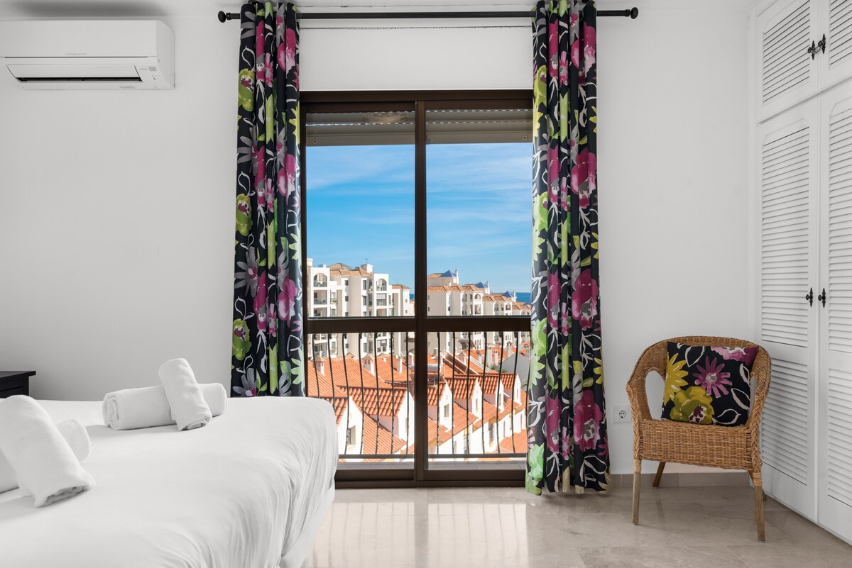 The area around the apartment is a quiet residential area with only 500m to Puerto Estepona (harbour) and 400m to Playa del Cristo which is a popular beach with lovely beach restaurants. A short walk from the apartment there is also a padel facility with 10 courts and a gym. Nearby there are also several wonderful markets every Wednesday 9-13:00 and Sundays 8-14:30 in the bullring.When you step through the door, you are greeted by the fully equipped kitchen on the left, with dishwasher, kettle, toaster, coffee maker and everything you need to be able to cook on holiday. Straight ahead you enter the spacious living room with a large smart TV, comfortable sofas and armchairs and a lovely terrace with a wonderful view of the mountains and the sea. There is also a toilet.