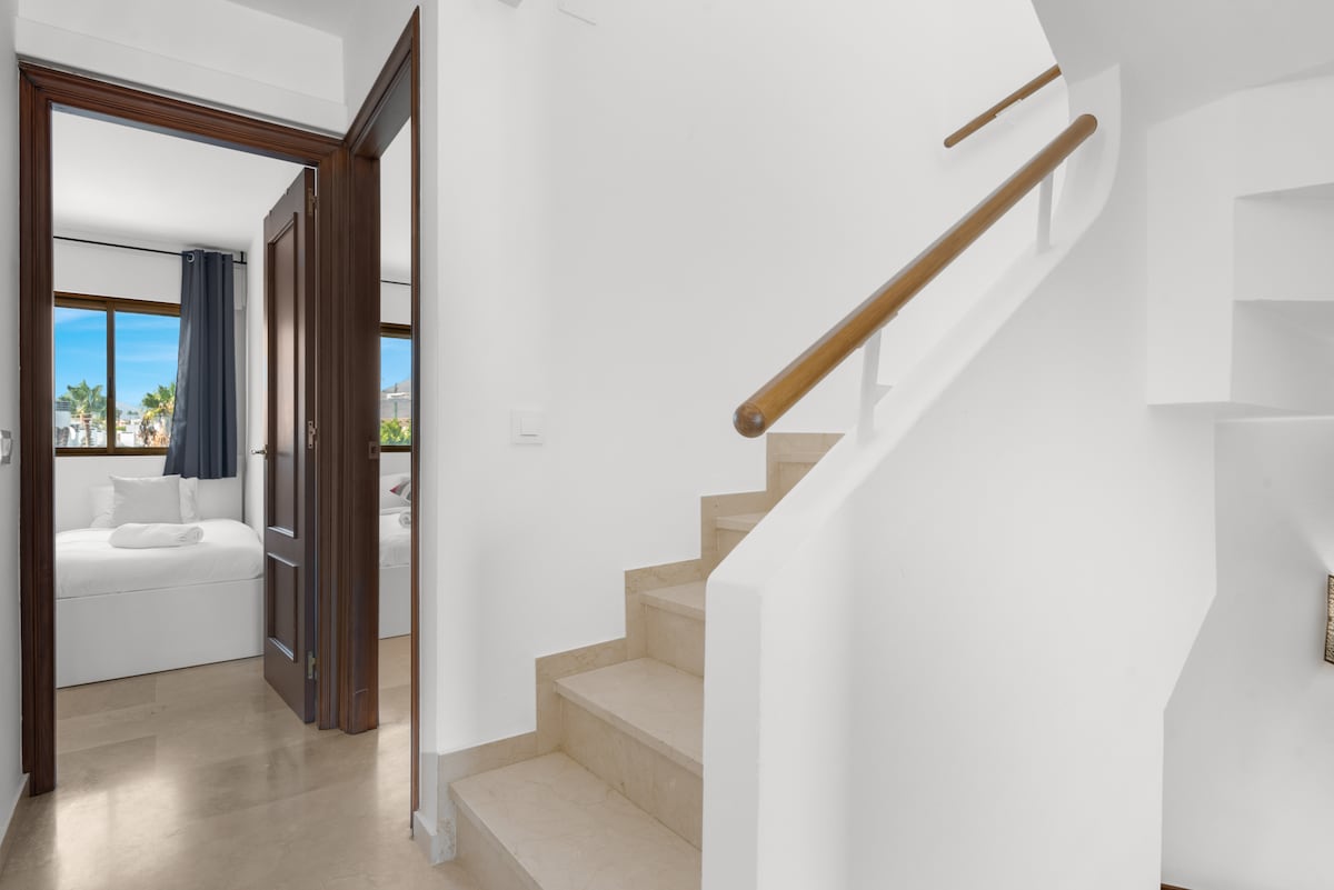 One floor up are all the bedrooms, the first bedroom has a large double bed, private balcony and ensuite bathroom, the second bedroom has a double bed and the third bedroom has 2 single beds. There is also a bathroom.