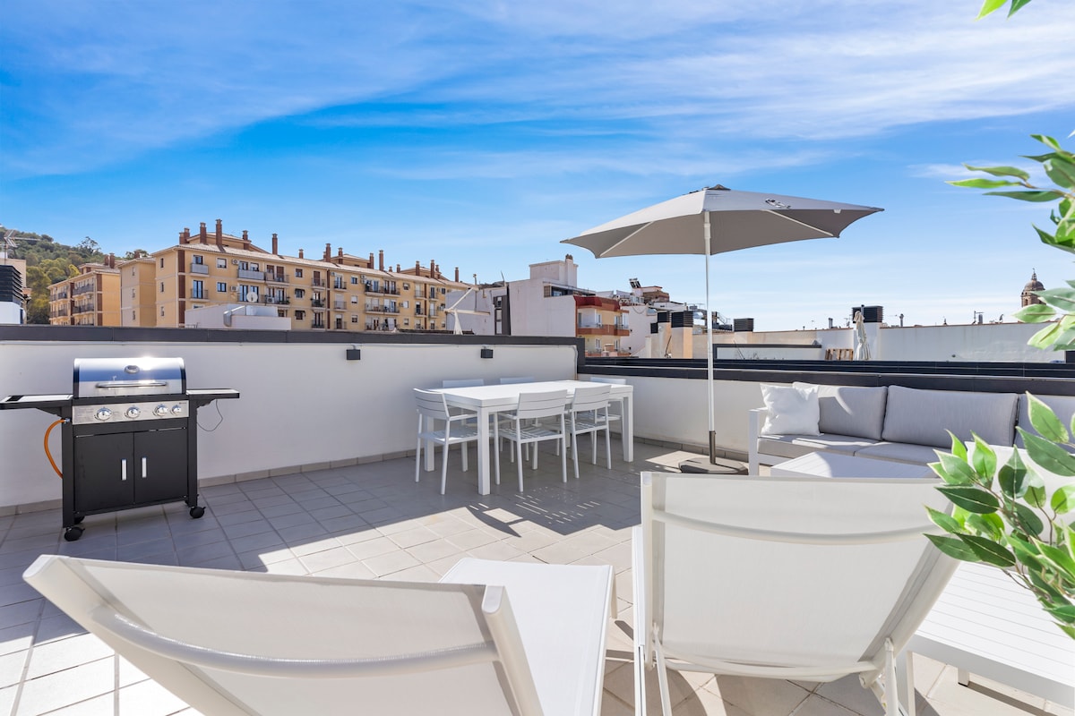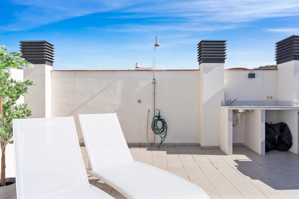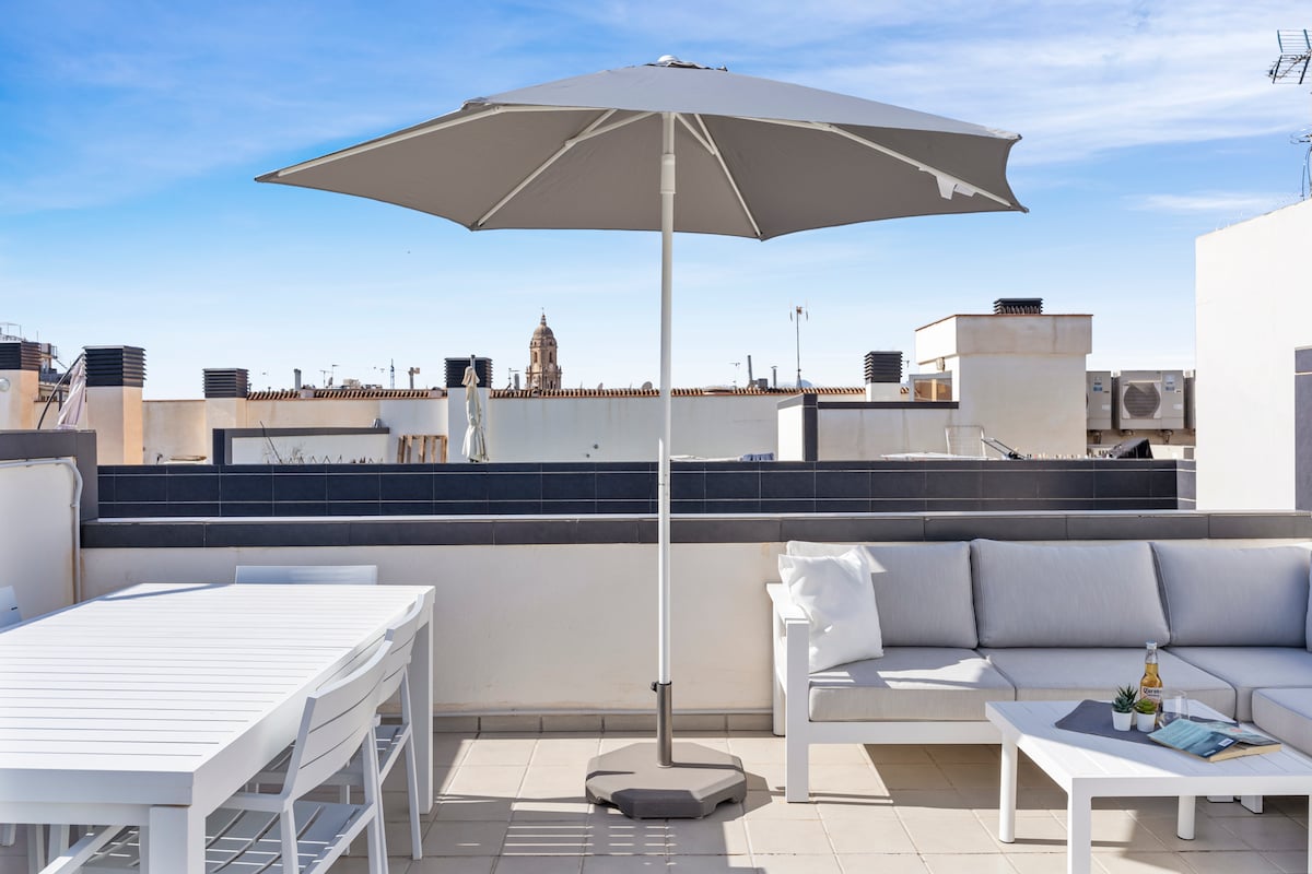 The apartment features a cozy bedroom (overlooking the patio and 1 bathroom, fully stocked with bed linen and towels for your comfort. The living space is equipped with a TV and a dining area, leading to a fully equipped kitchenette, making it easy for you to prepare and enjoy your meals. The crown jewel of this top floor apartment is its terrace, offering breathtaking city views, complete with an outdoor dining area where you can savor the ambiance of Málaga’s picturesque surroundings.The cleaning fee includes a set of bed linen and towels per person