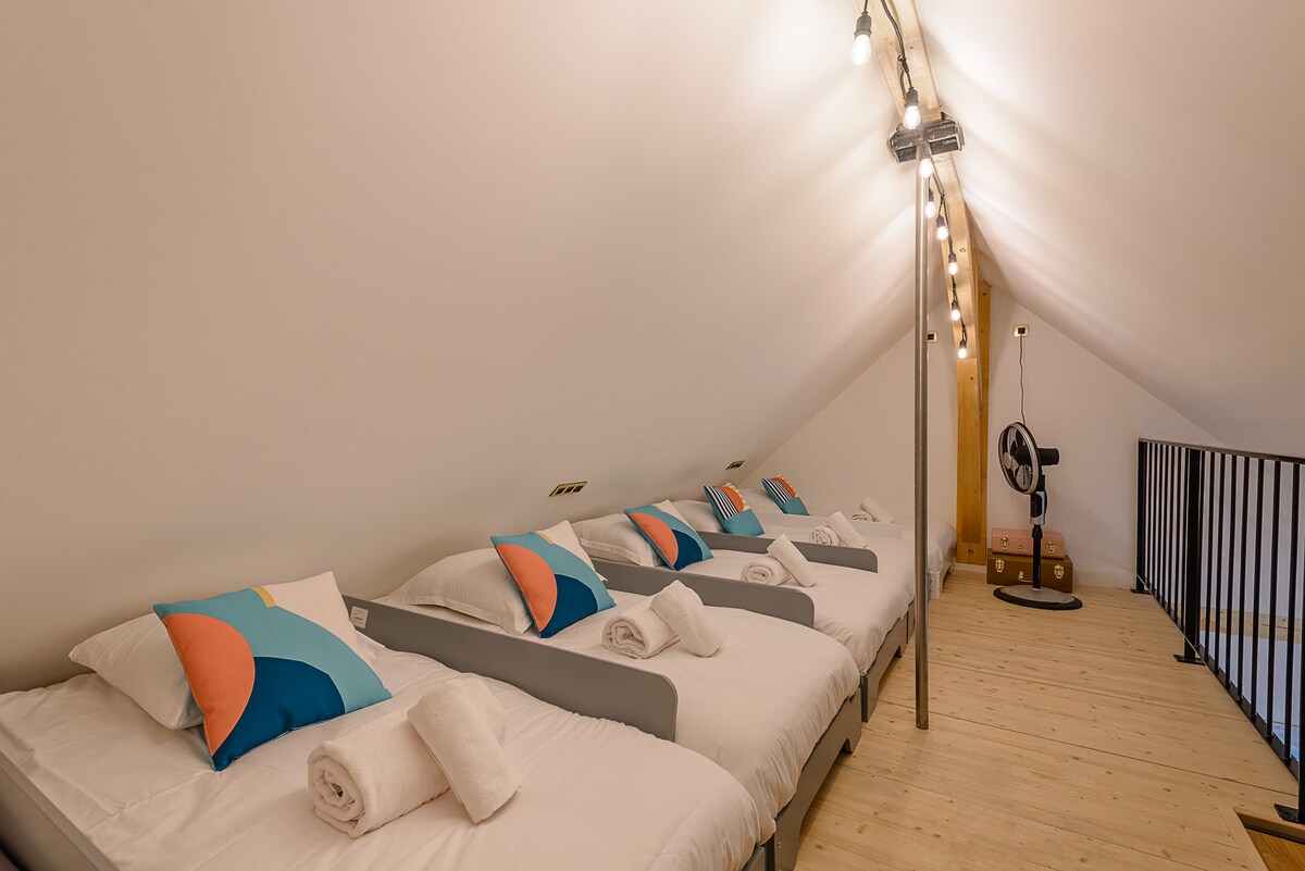 - Children's in bedroom n°5 fitted with 5 single beds on a mezzanine access by a steep staircase, en-suite bathroom with shower, bath and separate toilet, and a sitting area with sofa and Tv.