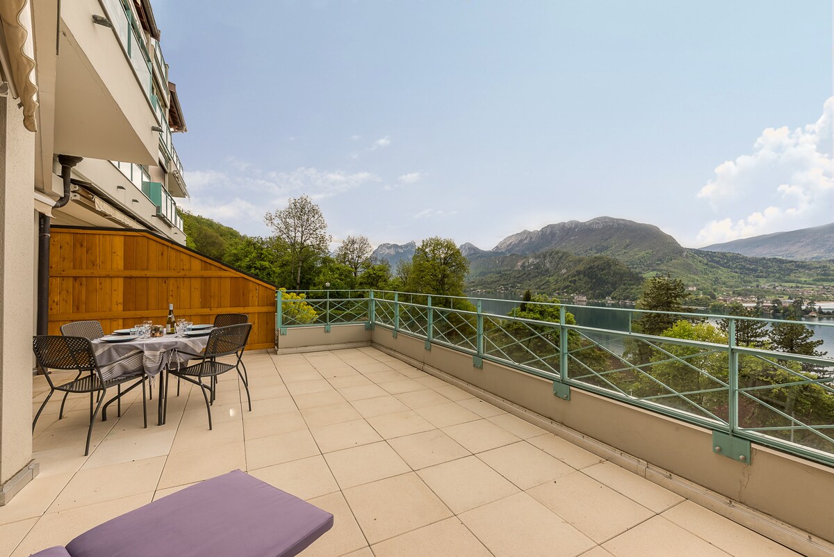 - Terrace of 204,514 sqf with garden furniture and an exceptional view of the bay of Talloires and the lake
