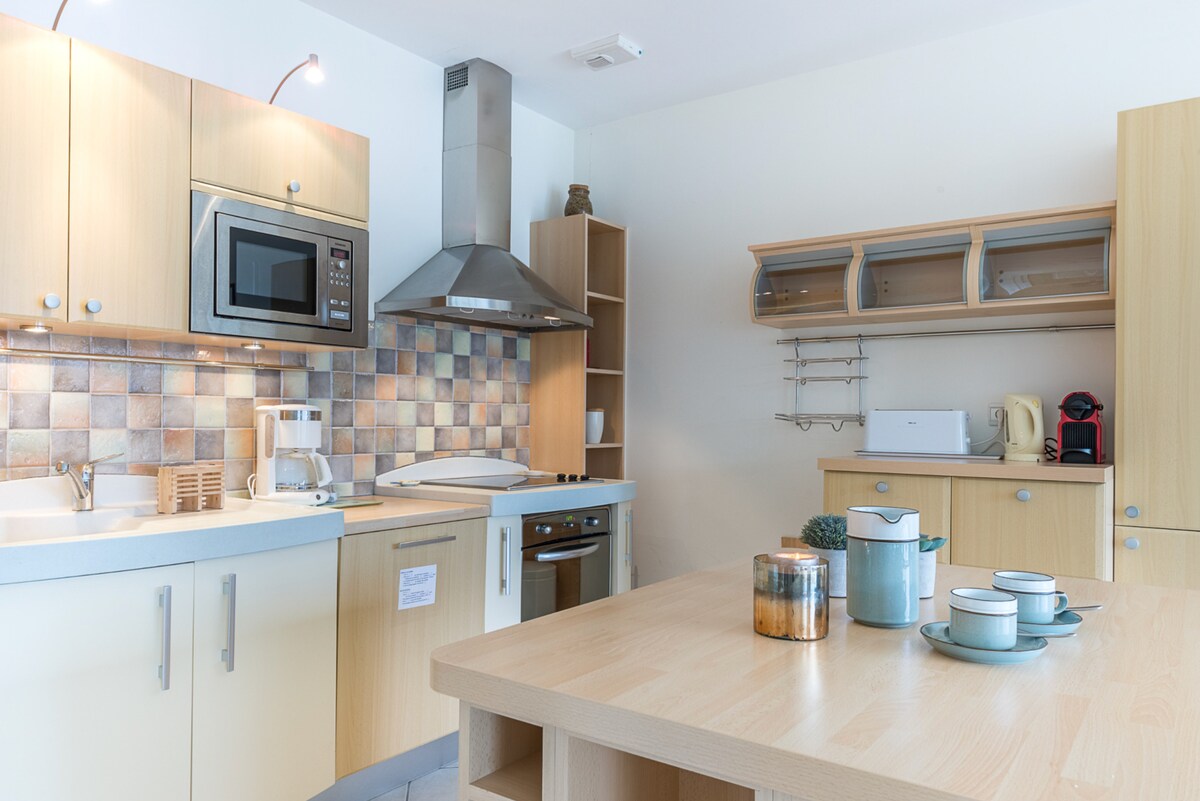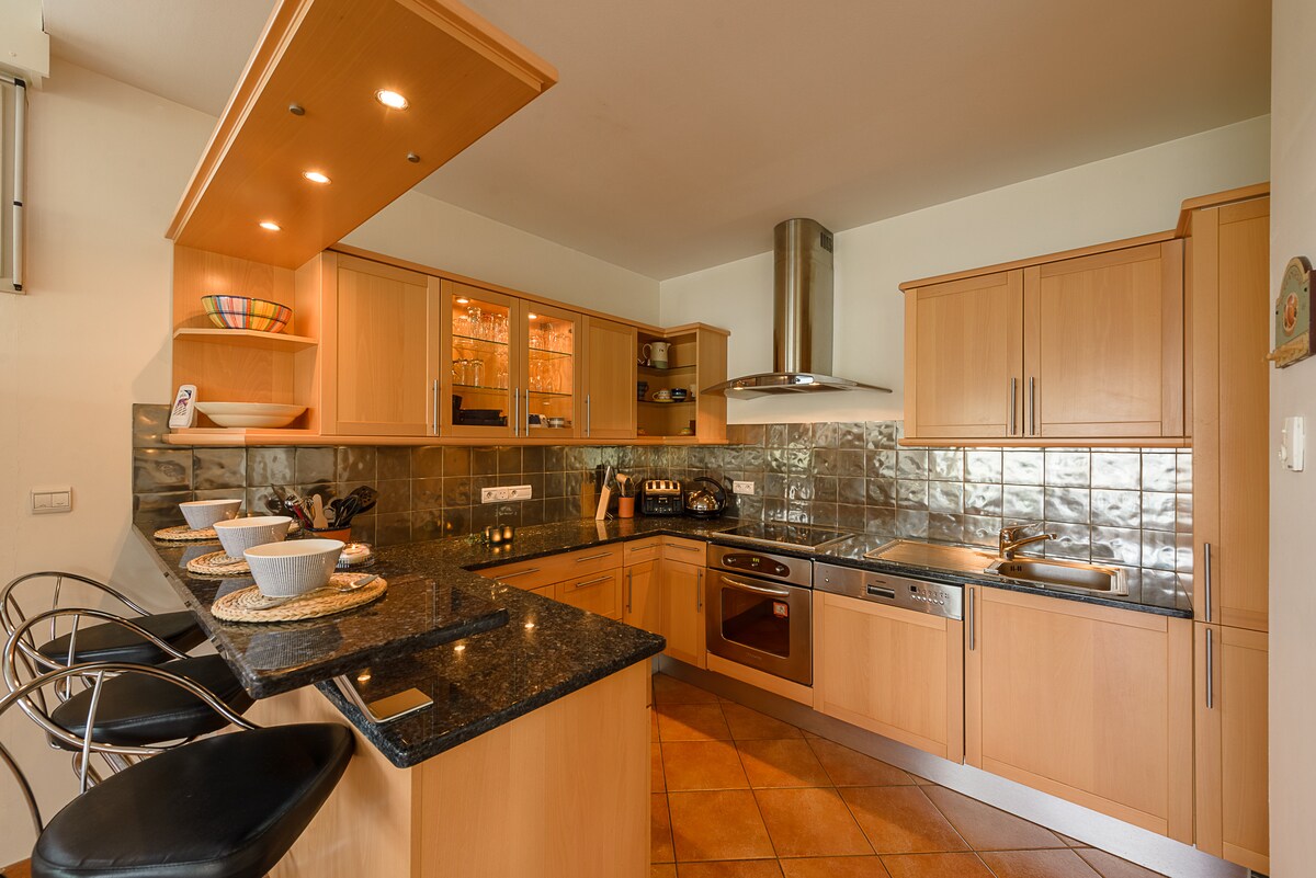 - Fully equipped kitchen open to the living area with a bar and 3 high chairs