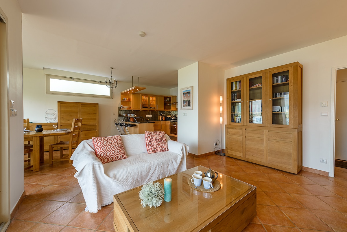 - Bright living room with a lounge area with 2 sofas and Tv, a dining room that can accommodate up to 6 people and storage cupboards with cookbooks, fondue and raclette machines, speakers, board games...