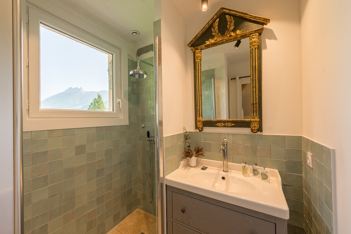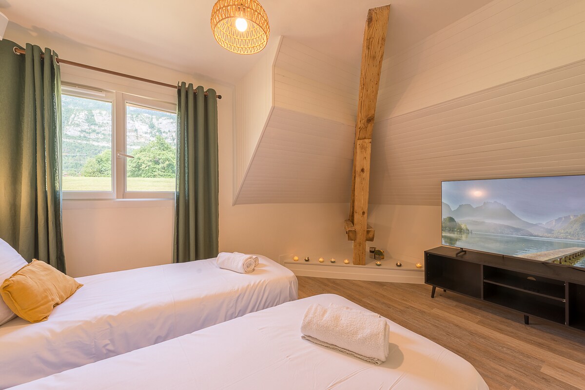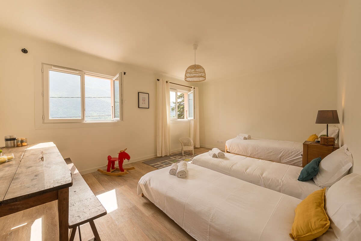 - Bedroom n°2 (South facing, back to the lake, view on the mountains) : 2 single beds of 80x200 twin, a shower room and a Tv, Sonos system, view on the garden