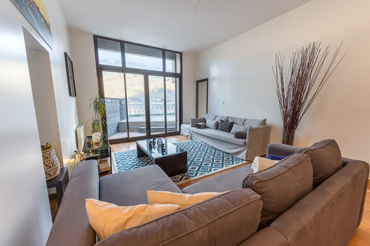 Located on the ground floor of a residence renovated a few years ago, you will enjoy a breathtaking view of the lake and the mountains from the living room and the two bedrooms.