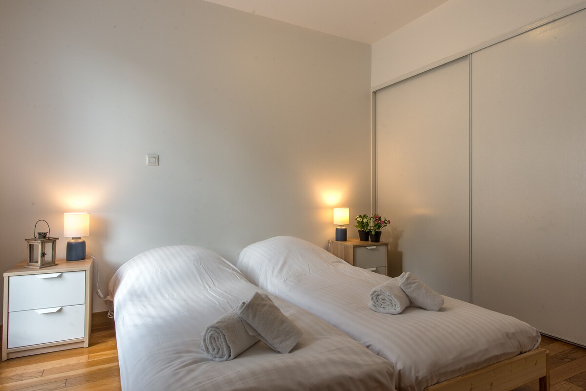 - 2 Twin bedrooms each with 2 single beds next to each other (80x200cm each), closets, balcony access.
