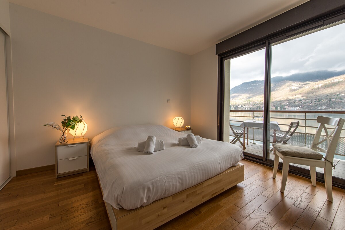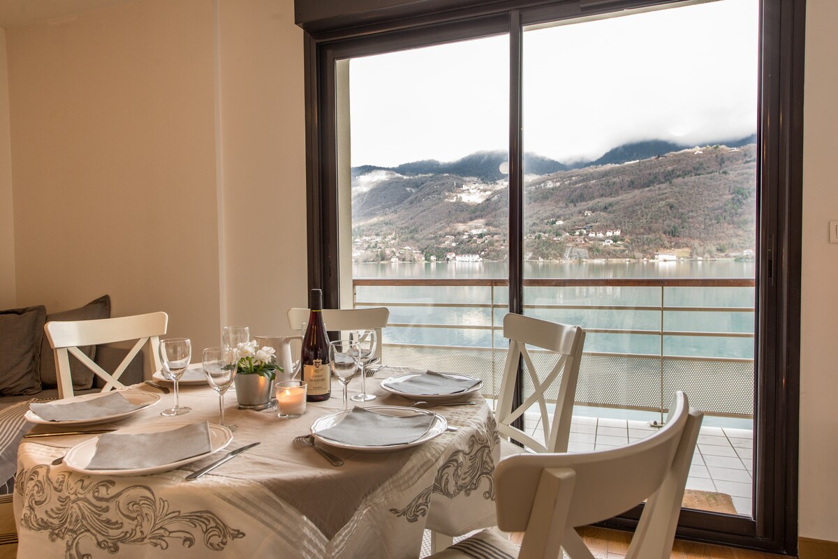 This wonderful and spacious apartment is situated on the 3rd floor of an 4 star residence, offers an amazing view on the Lake Annecy and the mountains. Private access via the residence to the lake.