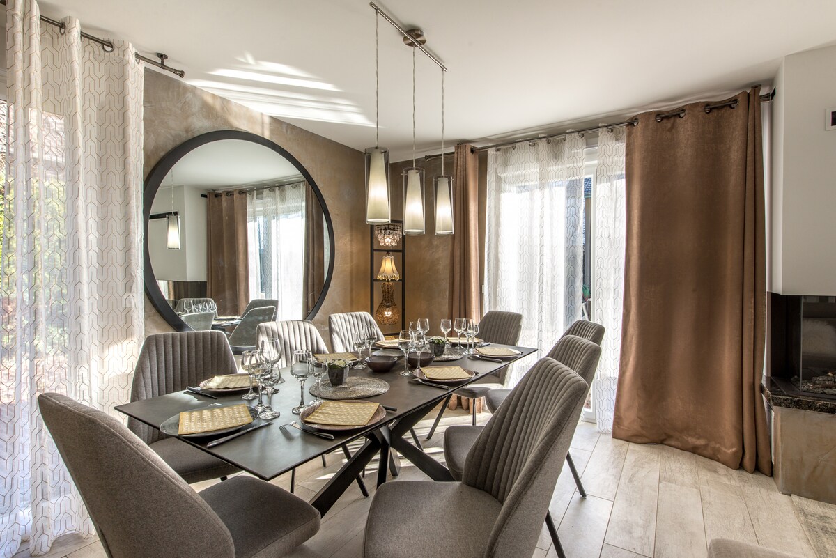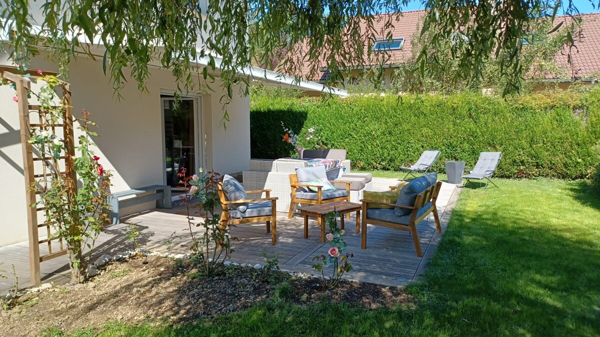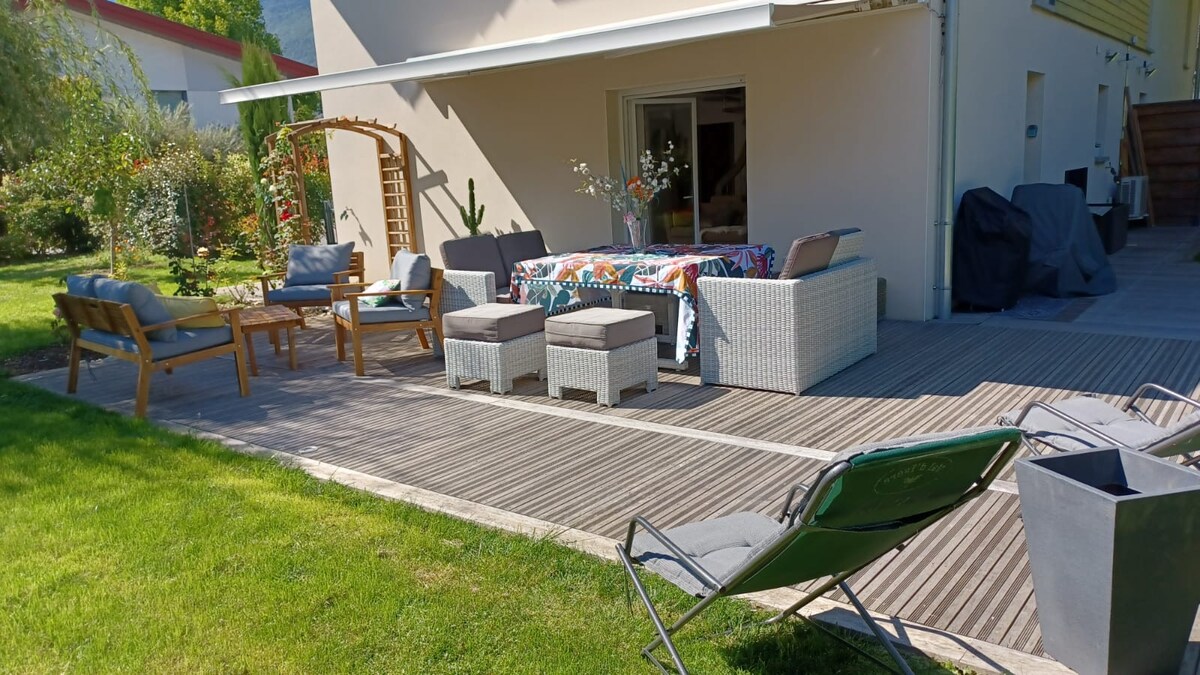 - Spacious living room with Tv lounge area (connected Tv, Netflix, Youtube...), gas fireplace and dining area that can accommodate 8 people. The whole being opened on the terrace and the garden by large glass openings thus offering much light. Direct access to the wooden terrace, with a superb exterior with pleasant garden furniture and plancha. Very nice view of the mountains, sunshine ++.