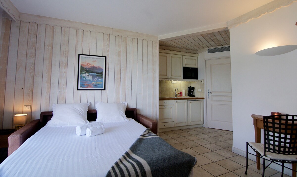 This 247 sq. f studio located on the 1st floor, offers a breathtaking view, access to the lake only 30m away and a superb view of the mountains and lake.
