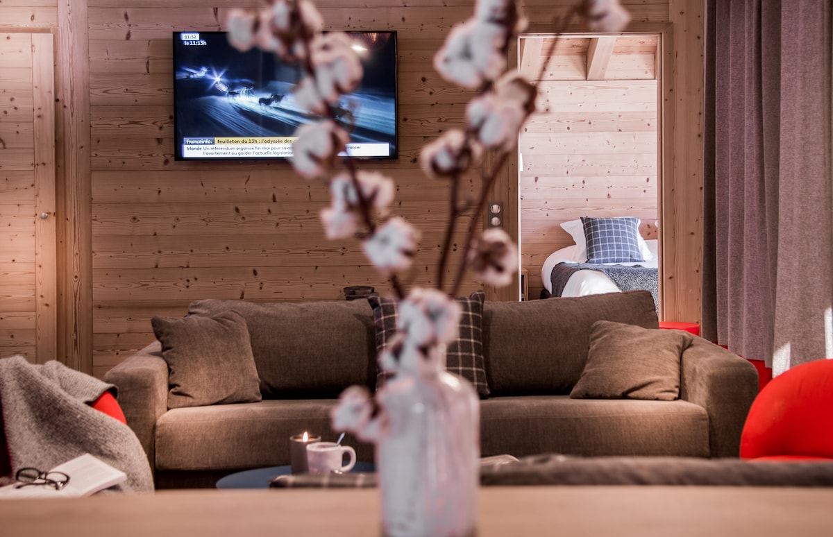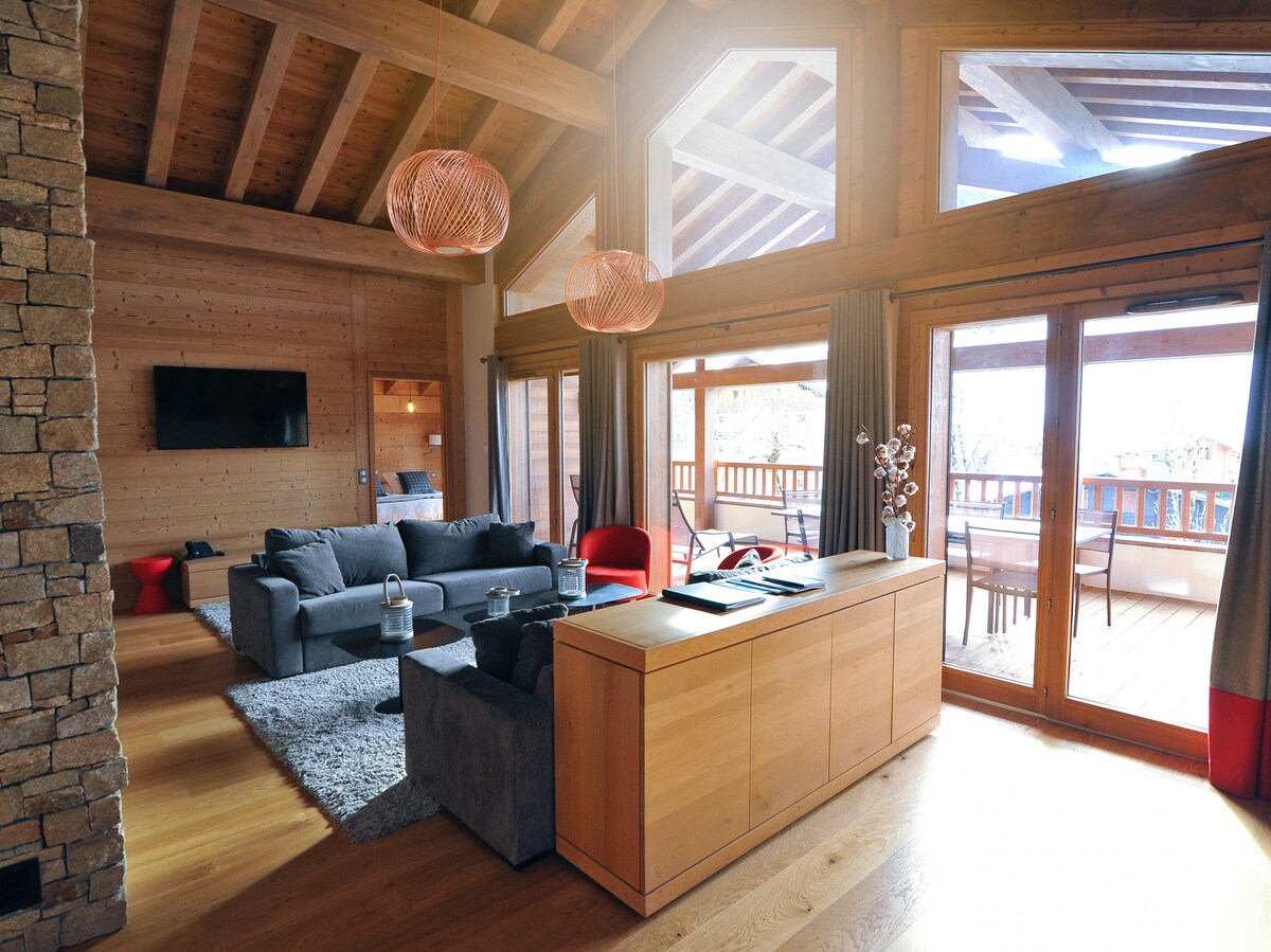 The light and warmth of the living area make it one of the most charming rooms in La Clusaz. Once the day's skiing is over, this living area is a natural invitation to rest, comfort and relax by the fireplace set into a stone column.