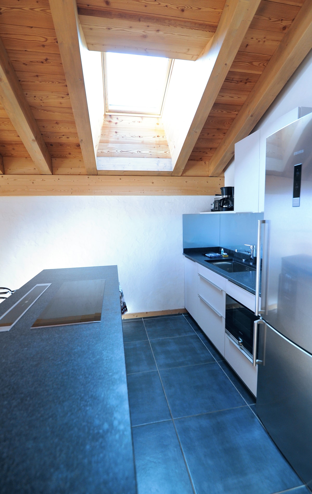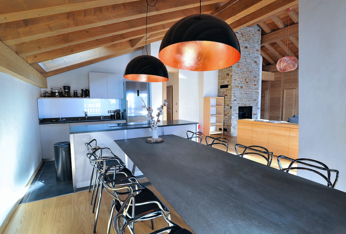 - Kitchen area open to the living room, fully equipped with induction hob, oven, microwave, fridge, dishwasher and dining table for 10 people
